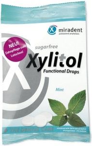 MIRADENT XYLITOL DROPS stanowią doskonałą alternatywę lub uzupełnienie dla gum do żucia z ksylitolem. Przeznaczone są dla osób z suchością jamy ustnej (kserostomia), a także dla pacjentów protetycznych i ortodontycznych.Miradent Xylitol cukierki opracowano specjalnie do uzupełniania codziennej higieny jamy ustnej. Stanowią one doskonałą alternatywę i uzupełnienie gum do żucia z ksylitolem. Przeznaczone są dla osób z suchością jamy ustnej (kserostomia), a także dla pacjentów protetycznych i ortodontycznych. Dzięki właściwości ksylitolu powstaje efekt chłodzący, który zgodnie z badaniami naukowymi ma działanie kariostatyczne i antykariogenne. Wywołuje przyjemne uczucie świeżości. Cukierki z ksylitolem przeznaczone są także dla diabetyków, jako idealne uzupełnienie codziennej higieny jamy ustnej.Ksylitol cukierki słodzone w 100% słodzone ksylitolem w trzech smakach: melon, wiśnia i mięta zapobiegają gromadzeniu się płytki nazębnej na powierzchni zębów, remineralizują szkliwo, nie zawierają glutenu. Wszystkie produkty Miradent z ksylitolem nie zawierają składników genetycznie zmodyfikowanych, np. takich jak: aspartam, sorbitol, laktoza, i gluten. Europejski Urząd ds. Bezpieczeństwa Żywności (EFSA) zaleca ksylitol do ochrony przed próchnicą. Zalety stosowania cukierków z ksylitolem MIRADENT Xylitol Drops zapobiegają gromadzeniu się płytki nazębnej na powierzchni zębów zwiększają wydzielanie śliny (ważne u osób cierpiących na jej nadmierną suchość) działają przeciw próchniczo remineralizują szkliwo zębów nie zawierają : aspartamu, sorbitolu, laktozy, i glutenu przyjazne veganom mogą być stosowane przez diabetyków Opakowanie zawiera: 25 sztuk dropsów o smaku mięty Wartość odżywcza w 100 g produktu: wartość energetyczna 945 kj/226 kcal, na 1 szt: 22 kj/5,2 kcal; białko 0g, węglowodany 95,2 g w tym cukry 0g, tłuszcz 0g, sód 0 g, błonnik 0 gZalecana dawka : 4 sztuki na dzieńOstrzeżenie: spożycie większej ilości może spowodować efekt przeczyszczający Skład: Xylitol, Gum Arabic, Flavour, Magnesium stearate, malic acidREF 630 172