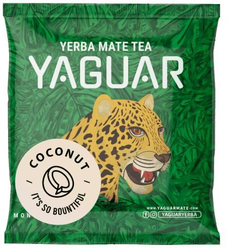 Dla zagorzałych fanów kokosa „Yaguar Coconut” jest idealnym wyborem! Przyjemny, egzotyczny aromat z pewnością otuli Cię już po otwarciu opakowania. Duże wiórki kokosa mienią się wśród zieleni yerba mate, podkreślonej żółtymi płatkami nagietka. Uroczy dodatek trawy cytrynowej i kwiatów głogu jeszcze bardziej podkreśla kokos. Równie pyszne, czy podawane na ciepło, czy z lodem!Moc: średnia (3/5).Goryczka: zrównoważona, z wyczuwalną goryczką (3/5).Sposób przygotowania: dodać wodę o temperaturze nie wyższej niż 80°C.Składniki: 87,15% yerba mate, 8% wiórki kokosowe, płatki nagietka, trawa cytrynowa, kwiaty głogu, aromat kokosowy. Produkt może zawierać orzeszki arachidowe, orzechy oraz zboża zawierające gluten.Warunki przechowywania: przechowywać w chłodnym, suchym miejscu. Chronić przed wilgocią.*****Dlaczego Yerba Mate?Rdzenne plemiona Ameryki Południowej uważały herbatę mate za dar bogów. Nie powinno to dziwić, biorąc pod uwagę jego niesamowite właściwości:- NATURALNE ŹRÓDŁO KOFEINY. Alternatywa dla kawy.- NIESAMOWITY SMAK. Delikatny i lekko gorzki. Masz gwarancję, że to pokochasz!- WSPIERA TWÓJ METABOLIZM. Pomaga ograniczyć apetyt i wspomaga trawienie.- DUŻO WITAMIN I PRZECIWOKSYDANTÓW. Dokładnie to, czego potrzebuje Twoje ciało!*****Jaguary zawsze były symbolami władzy wśród rdzennych plemion Ameryki Południowej……podobnie jak energetyzujące napary z herbaty yerba mate!„Yaguar” został stworzony, aby uhonorować zarówno dostojnego drapieżnika, jak i bogatą różnorodność biologiczną jego rodzimego kontynentu. Herbaty „Yaguar” produkowane są ze starannie wyselekcjonowanych liści rosnących w lasach tropikalnych Basenu Parana w Ameryce Południowej. Dzięki tradycyjnym technikom suszenia i osiemnastomiesięcznemu procesowi dojrzewania, yerba mate może pochwalić się szczególnie harmonijnym smakiem i wysoką zawartością kofeiny.