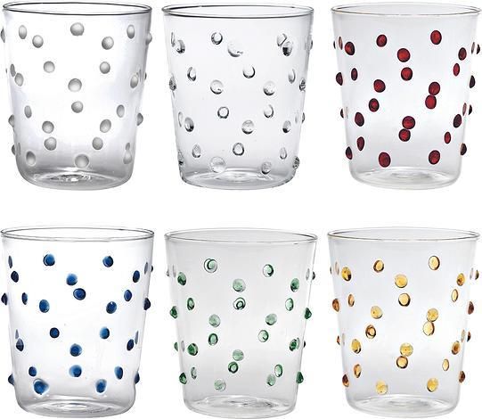 Linia Party prezentuje eleganckie, ręcznie wykonane szklanki ze szkła borokrzemowego, "neutralnego" materiału, lekkiego, przezroczystego i odpornego na szok termiczny, idealnego do przechowywania gorących napojów. Powierzchnia tych szklanek jest wzbogacona delikatnymi kolorowymi elementami reliefowymi, nakładanymi na gorąco i inspirowanymi fascynującym motywem "polka dot". Model ten jest w dwóch wariantach: szklanka do wody o pojemności 45 cl i szklanka "junior" o pojemności 9,5 cl, idealna do serwowania kawy, likierów i alkoholi pod koniec posiłku lub do prezentowania sosów bouche w stylowy i zabawny sposób. Kolekcja Party jest oferowana w opakowaniach po sześć sztuk, z możliwością wyboru między dekoracjami w tym samym kolorze (dostępne w kolorze białym, przezroczystym, czarnym, czerwonym, niebieskim, różowym, zielonym i złotożółtym) lub w żywej kombinacji (biały, przezroczysty, czerwony, niebieski, zielony i złotożółty). Projekt sygnowany przez Federico de Majo dopełnia eklektyczną elegancję Party. Dane techniczne Pojemność: 45 cl Średnica: Ø 90 mm Wysokość: 103 mm Typ: Kieliszki Marka: ZAFFERANO Kolekcja: Kieliszki Party Materiał: szkło