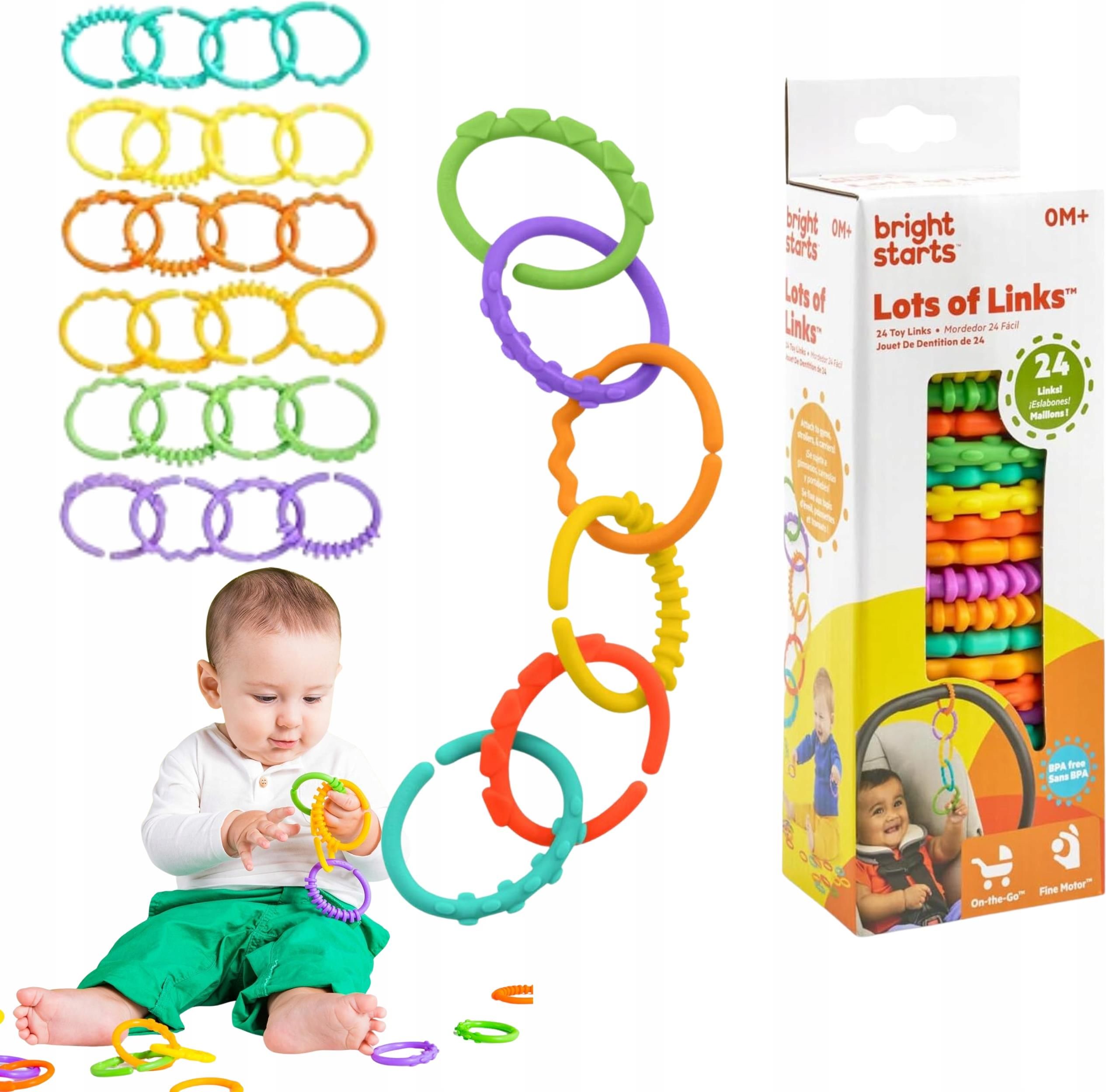 Zestaw gryzaków i łączników dla niemowląt dzieci Bright Starts 24 elementy Kolorowy, praktyczny i w 100% bezpieczny zestaw Bright Starts Fun Links to must-have dla każdego malucha! To nie tylko gryzaki, ale również sensoryczne ogniwa, które wspierają rozwój dziecka i zapewniają mnóstwo zabawy. DLACZEGO WARTO 24 kolorowe elementy o różnych fakturach – stymulują zmysł dotyku i wzroku Wielofunkcyjne zastosowanie – mogą służyć jako gryzaki lub łączniki do mocowania zabawek na wózku, foteliku czy macie Rozwój przez zabawę – wspiera koordynację ręka–oko i rozumienie przyczyny i skutku Bezpieczne materiały – wykonane z trwałego tworzywa sztucznego, wolnego od BPA Łatwe w czyszczeniu – wystarczy przetrzeć lub umyć pod bieżącą wodą ZALETY ZESTAWU Kreatywna zabawa – dziecko może łączyć, przekładać i tworzyć własne konstrukcje Uniwersalne zastosowanie – pasują do większości zabawek, gryzaków i zawieszek Idealne w podróży – lekkie, poręczne, łatwe do spakowania 🎁 IDEALNY PREZENT DLA MALUSZKA Zestaw Bright Starts Fun Links to doskonały pomysł na prezent dla niemowląt – rozwija, bawi i zajmuje malucha na długo. 🧡 Bright Starts – radość, nauka i bezpieczeństwo w każdej chwili zabawy!