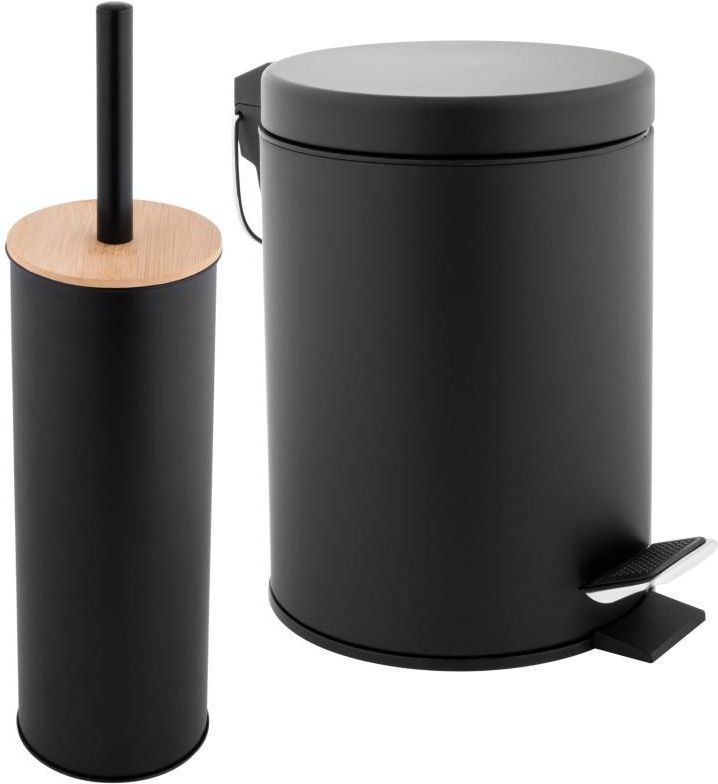 W skład zestawu wchodzą Elegancka Szczotka WC z Bambusowym Akcentem Elegancka szczotka do toalety wykonana z wysokiej jakości stali malowanej proszkowo na czarny mat, wzbogacona o elementy z naturalnego bambusa. Funkcjonalna i estetyczna, wyposażona w wyjmowany plastikowy pojemnik, który zapobiega gromadzeniu się wody. Główka szczotki również w kolorze czarnym – idealna spójność stylu. Stylowy Kosz na Śmieci w Czarnym Macie: Nowoczesny kosz łazienkowy wykonany z trwałej stali malowanej proszkowo. Wyposażony w wygodny pedał otwierający, plastikowy wkład z uchwytem oraz funkcjonalny tylny uchwyt do przenoszenia. Matowa czerń dodaje elegancji, a uniwersalna forma sprawia, że pasuje zarówno do łazienki, jak i toalety. Najważniejsze cechy kompletu Kosz Wykonany z trwałej stali malowanej proszkowo na idealnie gładki, matowy czarny kolor. Wygodny pedał nożny umożliwia otwieranie bez użycia rąk, co jest higieniczne i praktyczne. Wewnętrzny, wyjmowany pojemnik z uchwytem ułatwia opróżnianie i utrzymanie czystości. Podstawa z tworzywa sztucznego chroni podłogę przed zarysowaniami. Praktyczny uchwyt z tyłu kosza ułatwia jego przenoszenie Szczotka Wykonana z wysokiej jakości stali malowanej proszkowo na kolor czarny, gwarantującej trwałość i odporność na wilgoć. Elementy z naturalnego drewna bambusowego dodają ciepła i naturalnego charakteru. Wyjmowany plastikowy pojemnik z osłonką na ociekającą wodę zapewnia higienę i łatwość czyszczenia. Czarna główka szczotki doskonale komponuje się z całością. Zamknięta konstrukcja z bambusową pokrywką zapewnia estetyczny wygląd i dyskrecję. Specyfikacja Marka: Yoka Home Kod produktu: CH.LABI-BLK_P.TANGO Materiał: Stal malowana proszkowo / Bambus Kolor: Czarny-mat / Bambus Kosz Wysokość całkowita: 25 cm Średnica: 16,5 cm Grubość pokrywy: 3 cm Szerokość pedału otwierającego: 6 cm Pojemność kosza: 3 litry Szczotka Wymiary podstawy: 9 x 9 cm Wysokość całkowita: 38,5 cm Wysokość pojemnika szczotki: 27 cm Długość rękojeści szczotki: 11 cm Rodzaj szczotki: Zamknięta – posiada drewnianą pokrywkę na pojemnik Dlaczego warto wybrać nasz zestaw "Czarny Mat i Bambusowy Akcent"? Spójny design: Połączenie czarnego matu i naturalnego bambusa tworzy elegancki i nowoczesny wygląd, który doskonale uzupełni wystrój Twojej łazienki. Wysoka jakość materiałów: Stal malowana proszkowo i naturalne drewno bambusowe gwarantują trwałość i odporność na warunki panujące w łazience. Praktyczne rozwiązania: Wyjmowane pojemniki, pedał nożny w koszu oraz zamknięta konstrukcja szczotki WC zapewniają wygodę użytkowania i utrzymanie higieny. Uniwersalność: Zestaw doskonale sprawdzi się w łazienkach urządzonych w stylu nowoczesnym, minimalistycznym, loftowym czy skandynawskim. *Odcień elementów wykonanych z drewna bambusowego może delikatnie różnić się od tego, który prezentujemy na zdjęciach. Bambus ma dużą odporność na wodę, pod warunkiem, że odpowiednio o niego zadbasz. Polecamy konserwacje tego typu elementów dowolnym olejem naturalnym.