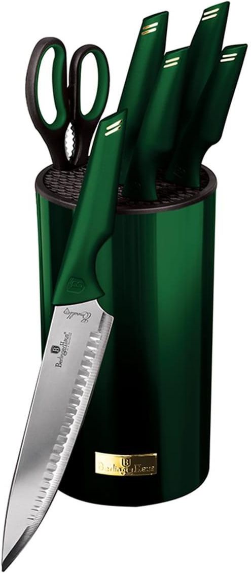 7 elementowy zestaw noży w bloku firmy BERLINGER HAUS z serii EMERALD COLLECTION. Przeznaczone do porcjowania mięsa i ryb, krojenia pieczywa oraz obierania i siekania warzyw. Noże ze stali nierdzewnej. Wyposażone w uchwyty pokryte bardzo trwałą cienką warstwą silikonu dla uzyskania pewnego trzymania w każdych warunkach. Cechy: Materiał: stal nierdzewna Idealnie nadają się do codziennego użytku, Ostrza ze stali nierdzewnej zapewniają siłę i trwałość Nie utrzymują zapachów żywności, Nie zostawią plam, Ergonomiczny uchwyt SOFT TOUCH dla wygody podczas cięcia. Eco Friendly - nie zawiera związków PFOA, ołowiu, kadmu W zestawie: · Nóż Szefa Kuchni 20 cm · Nóż do pieczywa 20 cm · Nóż do porcjowania 20 cm · Nóż uniwersalny 12,5 cm · Nóż do obierania 9 cm · Nożyczki · Stojak Noży kuchennych nie zaleca się myć w zmywarce