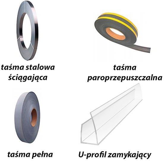 Zestaw zabezpieczający do szklarni zawiera taśmę pełną, taśmę paroprzepuszczalną, U-profil zamykający, taśmę stalową ściągającą. Zalety: zabezpieczenie przed zabrudzeniem komór, odprowadzenie kondensującej wody, wentylacja kanałów zapobiegająca nadmiernej kondensacji, wzmocnienie konstrukcji. 1. Górną krawędź płyty poliwęglanu należy okleić taśmą pełną, dolną krawędź - taśmą paroprzepuszczalną. 2. Kolejnym etapem zabezpieczenia otwartych komór jest założenie U-profilu zamykającego. 3. Taśma ściągająca (stalowa, ocynkowana) się wykorzystuje do stabilizacji poliwęglanu na szklarni, poprzez dociskanie płyt do łuków.