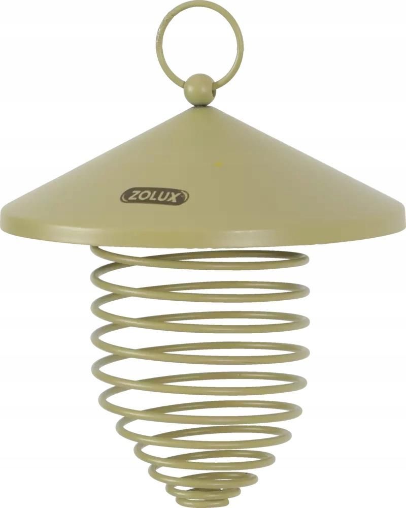 METALOWA SPIRALA - KARMNIK NA KULE TŁUSZCZOWE Z DASZKIEM - ZOLUX DUŻY Duża spirala na kule tłuszczowe przeznaczona do powieszenia na balkonie lub w ogrodzie. Niezastąpiona zwłaszcza w zimowe dni i wyczekiwana szczególnie przez sikorki. Karmnik jest zbudowany z drutu powlekanego, który tworzy sprężynę, po włożeniu kul sam wraca do poprzednich wymiarów i utrzymuje kule w środku. Daszek chroni kulki przed deszczem i śniegiem. Staraj się wieszać kule tam, gdzie ptaki mają gdzie usiąść. Przed włożeniem kulek do spirali, najlepiej wyciągnąć je z siatki. Staraj się wieszać kule tam, gdzie ptaki mają gdzie usiąść. Przed włożeniem kulek do spirali, najlepiej wyciągnąć je z siatki. PARAMETRY Wymiary wysokość spirali: 21 cm średnica spirali w najszerszym miejscu: 7,5 cm wysokość karmnika (z uchwytem) 27 cm Kolor: SZARY LUB OLIWKA WYSYŁANY LOSOWO W ZALEŻNOŚCI OD ZATOWAROWANIA SKLEPU. W SPRALI MIESZCZĄ SIĘ 3-4 KULE 90 G. KARMNIK SPRZEDAWANY BEZ KUL.
