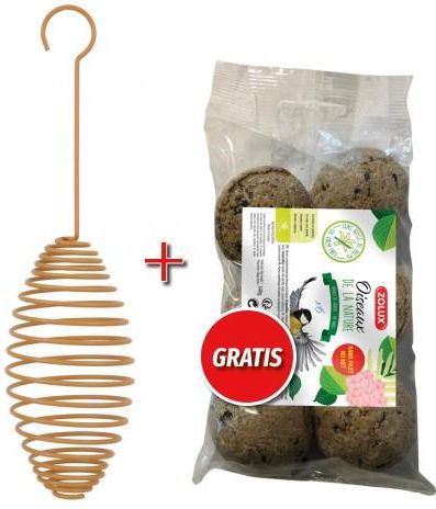 Zolux Zestaw spirala mała na kule tłuszczowe + 6 kul tłuszczowychSpirala na kule tłuszczowe małaJest solidnie wykonana, przeznaczona do powieszenia na balkonie lub w ogrodzie. Niezastąpiona zwłaszcza w zimowe dni i wyczekiwana szczególnie przez sikorki. Przed włożeniem do niej kuli usuń siatkowe opakowanie. Dlaczego stosować spiralę lub inny karmnik na kule? Ponieważ samotnie wisząca kula w siatkowym opakowaniu może stanowić niebezpieczeństwo zaplątania się ptaka - staraj się wieszać kule tam, gdzie ptaki mają gdzie usiąść. Wymiary spirali: 8 x 7 x 15 (25) cm Kule tłuszczowe dla dzikich ptaków.Jest to energetyczne jedzenie pozwalające im przetrwać zimę. Składające się ze zbóż, oliwy, ziaren i tłuszczu kule zapewniają ptakom dawkę energetyczną, która jest im potrzebna, zwłaszcza zimą. Nie zawierają szkodliwej soli ani oleju palmowego. Nadają się do karmienia wszystkich ptaków pozostających na zimę w kraju, m.in. wróbli, sikorek, grubodziobów, dzięciołów. Słonina kupowana w sklepie zazwyczaj zawiera sól - wbrew obiegowej opinii taka słonina szkodzi ptakom i lepiej stosować pokarm specjalnie dla nich przygotowany. Skład: zboże, oleje, tłuszcze, nasiona. Sposób podania: Należy je lekko zgnieść i zawiesić na drzewie lub w karmniku. Karmnik polecamy ustawić jesienią, by ptaki poznały wcześniej jego położenie. Waga: jedna kula - 90 g opakowanie 6 kul - 540 g