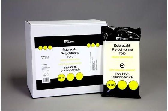 Czyściwo pyłochłonne AVATEX TC40 Czyściwo techniczne, pyłochłonne nowej generacji- TACK CLOTH STAUBBINDETUCH, nasączone wodoodpornym środkiem klejącym, kompatybilne ze wszystkimi rodzajami lakierów. Czyściwo techniczne nie strzępi się, nigdy nie wysycha, nie zostawia śladów. Dokładnie zbiera zanieczyszczenia nie pozostawiając śladów na czyszczonej powierzchni. Dostępne w postaci perforowanych rolek oraz w pojedynczych odcinkach pakowanych w karton. Kolor żółty. Bezwonne. Świetnie sprawdza się w branży motoryzacyjnej - do usuwania pyłu po szlifowaniu. wymiary listka: 40 x 37,5 cm ilość listków w pojedynczym opakowaniu: 10 ilość listków w kartonie zbiorczym: 160 opakowanie handlowe : 1 karton (160 listków) minimalna jednostka zakupu: karton 160 listów, podana cena za 160 listków