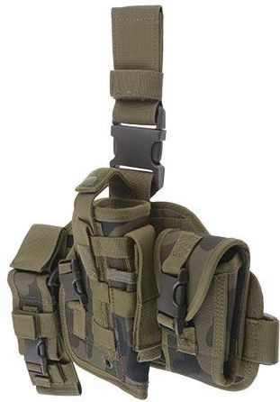 Panel udowy MOLLE Wykonanie: nylon Kolor: wz.93 pantera leśna Waga: 630g Panel wykonany jest z nylonu. Pas udowy zapinany jest za pomocą klamry i posiada regulację. Pas mocujący do pasa biodrowego również posiada klamrę umożliwiającą szybkie odpięcie panelu. Na całej jego powierzchni znajdują się palsy zgodne z systemem Molle. W zestawie z panelem znajduje się również kabura, ładownica na magazynek pistoletowy oraz mały zasobnik o wymiarach 100x900x25mm.