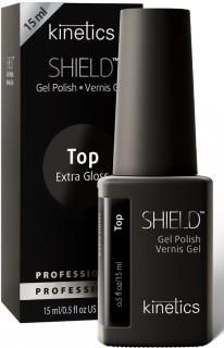SHIELD Gel Polish - Top Extra Gloss marki Kinetics. Top hybrydowy. Nadaje kuszący połysk paznokciom oraz wzmacnia intensywność lakieru kolorowego. Posiada bardziej wodnistą konsystencję niż tradycyjne lakiery hybrydowe, jednak bez obaw o spływanie z płytki podczas aplikacji. Po nałożeniu na paznokcie jego warstwa jest cieńsza, niż normalnie, ale jednocześnie zwiększa odporność lakierów hybrydowych na odpryskiwanie oraz przedłuża ich trwałość. Elastyczny pędzelek dostosowuje się do kształtu paznokcia, dzięki czemu zapewnia niezwykle łatwą i przyjemną aplikację. Lakier tworzy warstwę dyspersyjną i można go bez problemu przemywać cleanerem i removerem. Top hybrydowy.Nadaje mocny połysk.Zwiększa intensywność koloru.Przedłuża trwałość manicure'u hybrydowego.