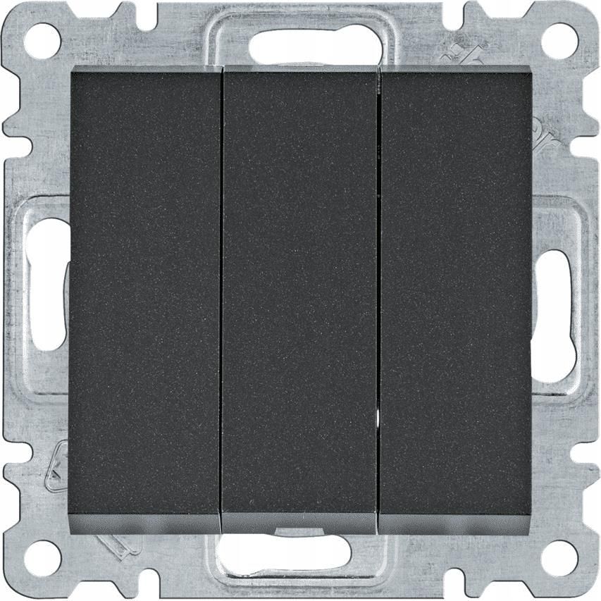 Łącznik 3-klawiszowy, 3-biegunowy w kolorze czarnym Dane techniczne Kod producenta - WL0073 EAN - 8694407003140 Kolor - czarny Materiał - tworzywo/metal Powierzchnia - mat Głębokość - 42 mm Głębokość montażu - 26 mm Wysokość - 71 mm Szerokość - 71 mm Montaż - z łapkami rozporowymi do podłączenia śrubowego Stopień ochrony - IP20 Napięcie znamionowe - 250 V Prąd znamionowy In - 10 AX Główna linia projektowa - lumina