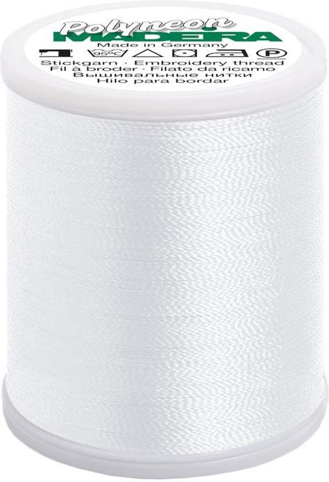 MADEIRA 9847 KOLOR 1801 Nić hafciarska Madeira Polyneon 40 - 1000m - kolor 1801 (bright white) Nić hafciarska Madeira Polyneon 40 do haftu 1000m w kolorze jasny biały (bright white) - 1801 Najwyższej jakości uniwersalna nić wykonana w 100% z poliestru. Znakomita do hafciarek przemysłowych i domowych - pozwala na uzyskanie rewelacyjnej jakości haftu. Jest wyjątkowo gładka, mocna, elastyczna i wytrzymała. Nie zrywa się. Z uwagi na na swoją trwałość, odporność na działanie wysokiej temperatury (można prać w 95°C) i chloru, nić wspaniale nadaje się do haftu na produktach, które są często prane, czyli m.in. na odzieży sportowej, roboczej, outdoorowej czy strojach dziecięcych. Nawet po wielu praniach nić zachowuje swoje właściwości, a kolory pozostają żywe i wyraźne, z właściwym połyskiem. Niemiecka firma Madeira to znany na całym świecie producent akcesoriów do szycia i haftowania. Używanie nici tej renomowanej marki pomaga osiągnąć trwały, efektowny haft najwyższej jakości. Do nici Madeira Polyneon 40 zalecane jest stosowanie igieł o grubości 75-80.