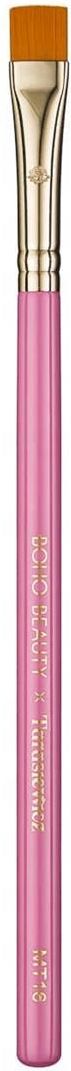 Pędzel MT16 to specjalistyczne narzędzie z autorskiej linii stworzonej we współpracy z wizażystką Marzeną Tarasiewicz, dedykowane do zadań wymagających najwyższej precyzji. Dzięki płaskiej, idealnie zakończonej główce z elastycznego włosia syntetycznego, pędzel pozwala na tworzenie ostrych linii, detali graficznych oraz bezbłędne odcinanie krawędzi (np. typu cut crease) przy użyciu produktów o płynnej i kremowej formule. Dlaczego warto wybrać ten pędzel: Perfekcyjnie płaski profil: Gęsta i zbita główka umożliwia niezwykle precyzyjną aplikację kosmetyków, co jest kluczowe przy elementach artystycznych oraz precyzyjnym konturowaniu detali oka. Elastyczne włókno syntetyczne: Wysokiej jakości włosie hipoalergiczne zapewnia odpowiedni opór podczas pracy, idealnie transferując produkty kremowe, korektory oraz eyelinery bez nadmiernego wchłaniania ich. Bezpieczeństwo i komfort: Delikatne włókna są przyjazne dla cer wrażliwych i atopowych oraz stanowią etyczny wybór dla wegan. Solidna konstrukcja: Ręczne formowanie główki, miedziana chromowana skuwka i ośmiokrotnie lakierowany trzonek gwarantują profesjonalną trwałość i odporność na częste mycie. Przeznaczenie: Tworzenie graficznych detali, odcinanie linii korektorem, aplikacja produktów kremowych i płynnych. Włosie: Syntetyczne - hipoalergiczne, elastyczne i gęste. Konstrukcja: Drewniany lakierowany trzonek, miedziana chromowana skuwka; seria Boho x Marzena Tarasiewicz. Wymiary: Długość pędzla: 16 cm; Długość włosia: 0,9 cm; Szerokość przy skuwce: 0,9 cm / 0,3 cm. Sposób użycia i pielęgnacja: Myj pędzel delikatnym szamponem w ciepłej wodzie i osusz włosiem w dół. Regularne stosowanie odżywki (dla włosia naturalnego) utrzyma miękkość i kształt pędzla.