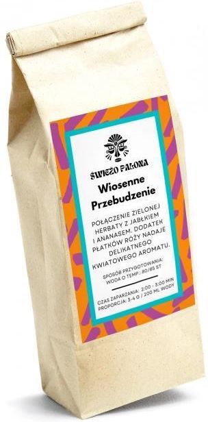 Herbata Wiosenne Przebudzenie to harmonijna mieszanka zielonej herbaty liściastej z dodatkiem suszonych owoców jabłka i ananasa, których świeżość i słodycz pobudza zmysły, wprowadzając w atmosferę radosnego poranka. Dodatek płatków róży nadaje tej herbacie delikatny, romantyczny aromat, który kojarzy się z wiosennymi ogrodami pełnymi kwiatów. Całość uzupełniona jest nutą imbirowo-cytrynową, która dodaje tej herbacie wyrazistości i lekkości, idealnie komponując się z owocowym smakiem. Sposób zaparzania Do przygotowania herbaty, należy zalać łyżeczkę mieszanki gorącą wodą o temperaturze około 80-85°C. Pozostawiamy do parzenia przez około 2-3 minuty, aby uzyskać delikatny i aromatyczny napar. Dłuższe parzenie może spowodować nadmierną goryczkę, dlatego ważne jest monitorowanie czasu parzenia, aby zachować balans smakowy. Działanie Ta herbata nie tylko przynosi orzeźwienie i radość w każdy wiosenny poranek, ale także może przynieść pewne korzyści zdrowotne. Zielona herbata jest bogata w przeciwutleniacze, które wspierają zdrowie serca i układu odpornościowego, podczas gdy dodatek owoców jabłka i ananasa dostarcza witamin i minerałów niezbędnych dla organizmu. Sposób przygotowania Woda o temperaturze 80-85 stopni Czas zaparzania: około 2:00-3:00 minut Proporcja: 3-4 gramy na 200ml wody Skład: herbata zielona liściasta, suszone jabłko, suszony ananas, płatki róż Dbamy o ekologię Nasze herbaty pakujemy w całkowicie biodegradowalną i kompostowaną folię NatureFlex. Wystarczą dwa miesiące, aby całkowicie rozłożyły się w domowym kompostowniku (można je także wyrzucać do odpadów bio). Dzięki temu w jeszcze większym stopniu na co dzień dbasz o środowisko!