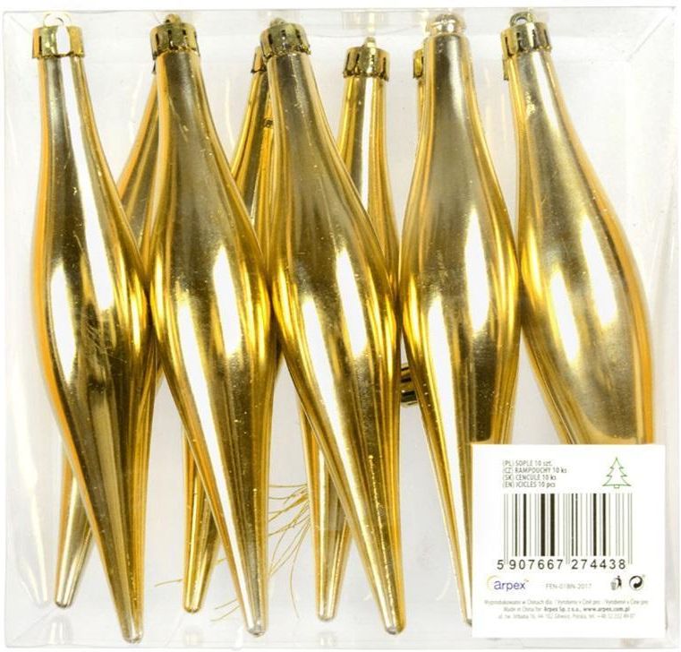 Sople W Pvc 15Cm (10 Szt.) Złote Sople __________________________________________________________________ Plastikowa ozdoba świąteczna do zawieszenia. Wielkość 15cm. Opakowanie zawiera 10 szt. EAN: 5902934226608 Parametry produktu: : Materiał wykonania: Plastik Kolor: Złoty Waga jednostkowa brutto: …