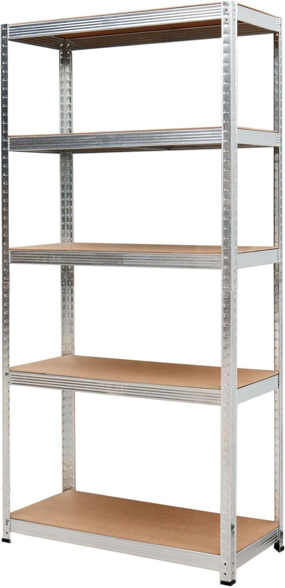 Konstrukcja zbudowana z metalowych ocynkowanych profili. Wytrzymałe półki z płyty MDF, wzmocnione dodatkowo wspornikiem. Każda półka może utrzymać obciążenie do 300 kg. Możliwość regulacji wysokości półek w zależności od użytkowania. Szybki i łatwy montaż bezśrubowy, na wcisk. Nakładki na nogi z tworzywa zapewniają lepszą stabilność i nie rysują podłogi. Sprawdzi się w magazynie, sklepie, piwnicy, spiżarni, garażu lub w warsztacie. Dane techniczne: Wymiary: 200 x 90 x 40 cm Ilość półek: 5 szt. Grubość półki: 6,0 mm Grubość profilu: 1,0 mm Maks. obciążenie: 300 kg Waga: 19 kg