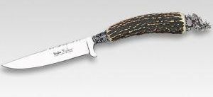 Linder 222210 Tradycyjny nóż bawarski z rękojeścią wykonaną z rogu jelenia. Na jej końcu figura jelenia odlana z nowego srebra (stop miedzi, niklu i cynku). Polerowane na wysoki połysk 10 cm ostrze ze stali nierdzewnej 420 z ozdobnym grzbietem. W zestawie pochwa.
