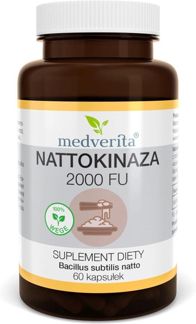 Medverita Nattokinaza 2000 FU Bacillus Subtilis Natto Serce Krążenie 120 kapsułek Nattokinaza zyskała popularność jako substancja działająca prozdrowotnie po wykazaniu korzystnych działań na układ sercowo-naczyniowy. Ponadto nattokinaza wspomaga łagodzenie objawów choroby Alzheimera, chorób związanych ze starzeniem się organizmu oraz w stanach zapalnych. Nattokinaza to enzym proteolityczny pozyskiwany z natto, tradycyjnej japońskiej potrawy, która powstaje w wyniku fermentacji soi przy udziale bakterii Bacillus subtilis natto. Enzym degraduje fibrynę, białko biorące udział w procesie krzepnięcia krwi. Każda kapsułka preparatu zawiera 2000 jednostek FU nattokinazy, gdzie FU oznacza jednostkę aktywności enzymu rozkładającego fibrynę. Produkt jest odpowiedni dla osób na diecie wegetariańskiej i wegańskiej. Kapsułki wykonano z celulozy, bez składników pochodzenia zwierzęcego. Nattokinaza to enzym, który może pomóc w profilaktyce i leczeniu chorób układu krążenia, takich jak zakrzepica, nadciśnienie, miażdżyca i zawał serca. Może również wspomagać trawienie i regulować poziom cholesterolu. Nattokinaza - co to i na co pomaga? Choroby układu krążenia Nattokinaza, jako środek fibrynolityczny, pomaga rozpuszczać skrzepy krwi, co jest ważne w profilaktyce i leczeniu zakrzepicy, zawałów serca, udarów i innych chorób układu krążenia. Przeciwzakrzepowe działanie Nattokinaza wpływa na krzepliwość krwi, rozrzedzając ją i zapobiegając tworzeniu się skrzepów. Wspomaganie trawienia Jako naturalny probiotyk, nattokinaza może wspomagać trawienie i regulować poziom cholesterolu. Zawartość netto: 120 kapsułek / 42 g Masa kapsułki: 350 mg Porcja zalecana do spożycia w ciągu dnia: 2 kapsułki dziennie najlepiej w trakcie posiłku. Uwagi: nie należy przekraczać zalecanej dziennej porcji. Przechowywać w sposób niedostępny dla małych dzieci. Suplement diety nie może być stosowany jako substytut zróżnicowanej diety. Utrzymanie prawidłowego stanu zdrowia wymaga zrównoważonego odżywiania i prowadzenia zdrowego trybu życia. Przechowywanie: w temperaturze poniżej 25°C, w oryginalnym opakowaniu w celu ochrony przed światłem i wilgocią. Składniki: błonnik akacjowy (Acacia senegal), sfermentowany ekstrakt z soi (nattokinaza)(Bacillus Subtilis natto), hydroksypropylometyloceluloza (HPMC)(otoczka kapsułki). Suplement diety nie zawiera zbędnych: substancji wypełniających, adsorbentów, substancji wiążących, konserwantów, substancji powlekających, substancji poślizgowych. Składniki: Nattokinaza w porcji (2 kapsułki): 2000 FU FU - jednostka degradacji fibryny