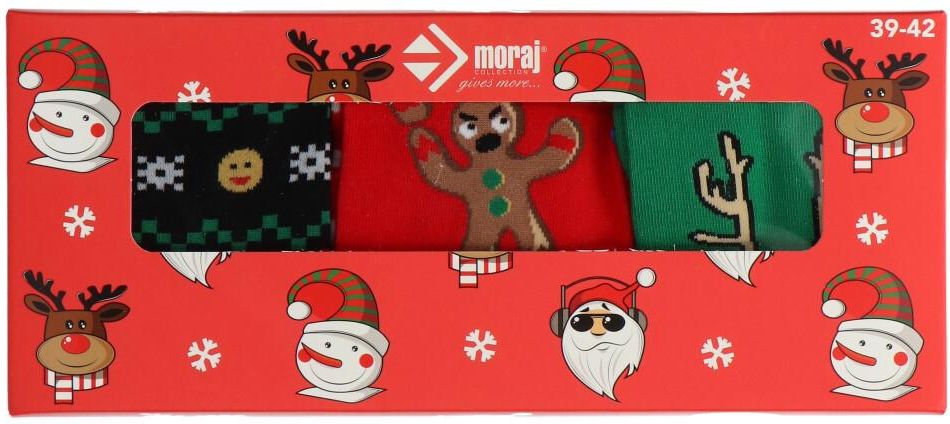 Klasyczne i wygodne skarpety świąteczne marki Moraj: - zestaw zawiera 3 pary skarpet, zapakowane w eleganckie pudełko - idealnie sprawdzą się jako prezent na święta oraz mikołajki - skarpetki idealnie dopasowują się do stopy a płaski szew nie uciska stopy- wykonane z miękkiej wysokogatunkowej bawełny - materiał łatwo przepuszczający powietrze gwarantując wysoki komfort użytkowania - skład: 65% bawełna 18% poliamid 15% poliester 2% elastan