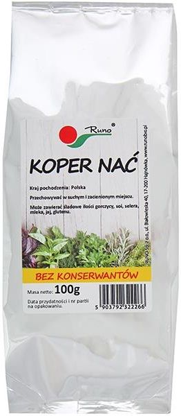 Runo Koper nać przyprawa zioła 100 g Koper to wyjątkowo smaczny dodatek do ziemniaków, ryb i sałatek. Koperek stanowi również popularny suplement, ze względu na swoje poprawiające trawienie właściwości. Herbatka z owoców tego warzywa to skuteczny lek na kolki niemowlęce i bóle brzucha. Produkty Runo pochodzą z ekologicznych upraw potwierdzone certyfikatem Rolnictwa Ekologicznego UE. Większość surowców pochodzi z upraw na pobliskich terenach Białowieskiego Parku Narodowego.