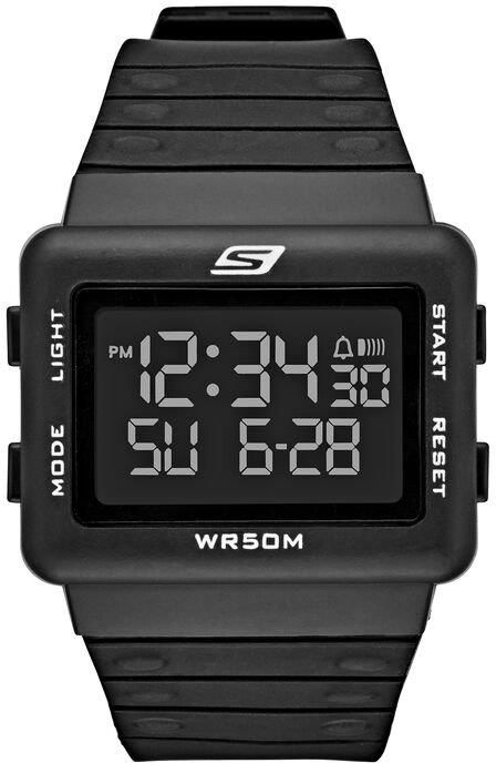 Skechers Zegarek Męski Larson Black Niech styl retro-cool zegarka Skechers Larson robi swoje, niezależnie od tego, pod jakim kątem na niego spojrzysz. Ten cyfrowy, wielofunkcyjny zegarek z chronografem ma prostokątną obudowę i elastyczny pasek na rękę. Trwała, lekka obudowa z tworzywa sztucznego Sportowy segmentowy pasek na rękę z tworzywa sztucznego z klamrą jest elastyczny i trwały Prostokątna konstrukcja z dobrze widoczną tarczą Cyfrowy wyświetlacz z funkcją stopera Cztery przyciski sterujące Timer, stoper, alarm i inne funkcje Małe logo Skechers Wodoodporność do 5 atmosfer