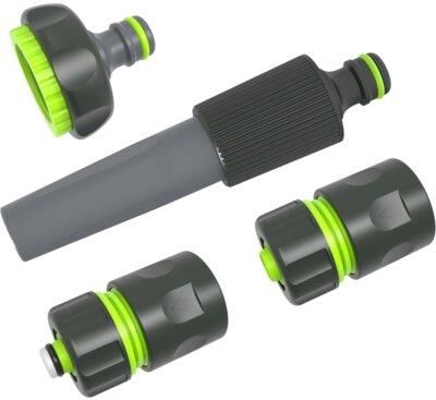Zestaw 4-elementowy z dyszą zraszającą STR 3/4″ STALCO GARDEN S101210415. UNI FIT - uniwersalny system łączenia, kompatybilny z armaturą innych producentów.