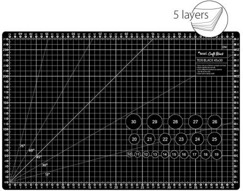 Dane techniczne maty podkładowej TEXI 45x30 cm – czarna: Dwustronna powierzchnia robocza Podziałka: centymetry, kąty (30°, 45°, 60°), linie pomocnicze Samoregenerująca (zasklepia drobne nacięcia) Chroni ostrza i powierzchnię roboczą Wymiar: 45x30 cm Grubość: 3 mm Liczba warstw: 5 Kolor: czarny TEXI …