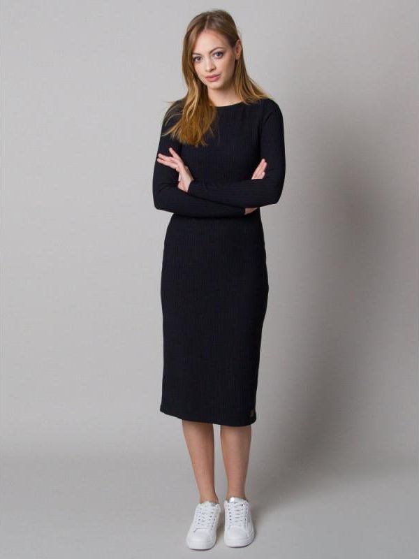 Sukienka dzianinowa Sukienka w kolorze czarnym, o prostym kroju, z długim rękawem i zabudowanym dekoltem, uszyta z elastycznej, prążkowanej dzianiny. Niezwykle kobieca sukienka ołówkowa za kolano, którą można nosić zarówno w stylu sportowym, casualowym, jak i eleganckim! Połącz sukienkę z …