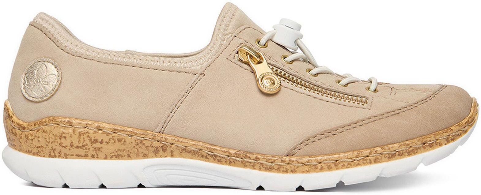 Jasnobeżowe sneakersy damskie Rieker to perfekcyjny wybór dla kobiet, które cenią komfort i nowoczesny design. Wykonane z włókienniczego materiału, zapewniają wyjątkową wygodę i trwałość. Okrągły nosek gwarantuje swobodę i komfort dla palców, niezależnie od długości noszenia. Technologia Rieker Antistress sprawia, że buty idealnie dopasowują się do stopy, łagodząc wszelkie naciski i absorbując wstrząsy, co przekłada się na niesamowity komfort chodzenia. Elastyczne sznurówki umożliwiają szybkie zakładanie i idealne dopasowanie do indywidualnego kształtu stopy. Sneakersy Rieker to nie tylko funkcjonalność, ale również styl, który uzupełni każdą codzienną stylizację. Musisz je mieć, by cieszyć się wygodą na najwyższym poziomie!