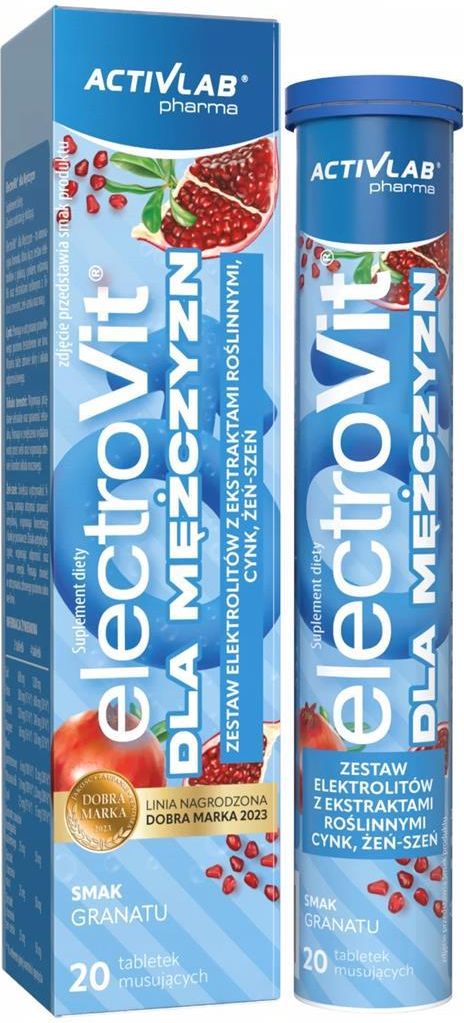 Activlab Pharma ElectroVit dla Mężczyzn – 20 Tabletek Musujących Activlab Pharma ElectroVit dla Mężczyzn to kompleksowy suplement diety w formie wygodnych tabletek musujących, stworzony specjalnie z myślą o potrzebach męskiego organizmu. Preparat łączy kluczowe elektrolity wspierające nawodnienie organizmu z dodatkiem składników aktywnych takich jak cynk, ekstrakt z buzdyganka naziemnego, macy oraz żeń-szenia, które wspierają witalność, siłę i funkcje reprodukcyjne. Formuła została wzbogacona o kwas pantotenowy i witaminę B6, które przyczyniają się do zmniejszenia uczucia zmęczenia i znużenia oraz wspierają prawidłowe funkcjonowanie układu nerwowego. Dzięki temu ElectroVit dla Mężczyzn sprawdzi się zarówno w codziennym wsparciu, jak i w okresach wzmożonego wysiłku fizycznego czy stresu. Korzyści ze stosowania Activlab Pharma ElectroVit dla Mężczyzn Wsparcie równowagi elektrolitowej i nawodnienia organizmu. Wzrost witalności, siły i funkcji seksualnych. Zmniejszenie uczucia zmęczenia i poprawa koncentracji. Wsparcie odporności i ogólnego samopoczucia. Orzeźwiająca forma musujących tabletek – szybkie działanie i łatwa suplementacja. Składniki Activlab Pharma ElectroVit dla Mężczyzn – 20 Tabletek Musujących Składniki: regulator kwasowości: kwas cytrynowy; diwęglan sodu; substancja wypełniająca: sorbitole; diwęglan potasu; chlorek potasu; sole magnezowe kwasu cytrynowego; aromat; węglan magnezu; koncentrat buraka czerwonego; substancja przeciwzbrylająca: glikol polietylenowy; diglicynian cynku; substancja słodząca: sukraloza; ekstrakt z owocu buzdyganka naziemnego (Tribulus terrestris); ekstrakt z korzenia macy (Lepidium meyenii); ekstrakt z korzenia żeń-szenia (Panax ginseng); D-pantotenian wapnia; chlorowodorek pirydoksyny. Produkt może zawierać pochodne zbóż zawierających gluten, soi i mleka. Składnik 2 tabletki 4 tabletki % RWS (4 tabletki) Sód 600 mg 1200 mg – Potas 300 mg 600 mg 30% Chlorek 120 mg 240 mg 30% Magnez 60 mg 120 mg 32% Kwas pantotenowy 6 mg 12 mg 200% Witamina B6 1,4 mg 2,8 mg 200% Cynk 7,5 mg 15 mg 150% Ekstrakt z owoców buzdyganka naziemnego 25 mg 50 mg – Ekstrakt z korzenia macy 25 mg 50 mg – Ekstrakt z korzenia żeń-szenia 25 mg 50 mg – *RWS – Referencyjna Wartość Spożycia Sposób użycia Rozpuścić 1 tabletki w 200 ml wody. Spożywać 2-4 razy dziennie, w zależności od indywidualnych potrzeb organizmu. Produkt przeznaczony dla osób dorosłych. Przeciwwskazania Nie stosować w przypadku uczulenia na którykolwiek składnik produktu. Nie przekraczać zalecanej dziennej porcji do spożycia. Produkt nie może być stosowany jako zamiennik zróżnicowanej diety. W przypadku stosowania leków, chorób przewlekłych, w tym problemów z ciśnieniem lub sercem, zaleca się konsultację z lekarzem przed rozpoczęciem suplementacji. Przechowywać w suchym miejscu, w temperaturze pokojowej, z dala od światła i wilgoci. Chronić przed dziećmi. Podmiot odpowiedzialny: REGIS Sp. z o.o., NIP: 6830007537