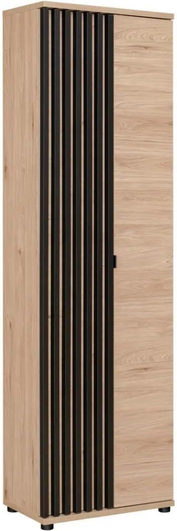 PEDRO szafa Typ A, kolor: korpus - Hickory Jackson / front - Hickory Jackson / aplikacja - Czarne pionowe lamele Wymiary całkowite (S/W/G): 60 cm / 202 cm / 35 cm szafa dwudrzwiowa, jedne drzwi wyposażone w uchwyt do otwierania, drugie drzwi zdobione czarnymi lamelami materiał: korpus i front płyta …
