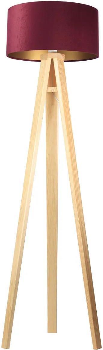 Lampa stojąca HOME 40 to propozycja do wnętrz w stylu glamour, ze względu na elegancki bordowy abażur ze złotym środkiem i solidną drewnianą podstawę.