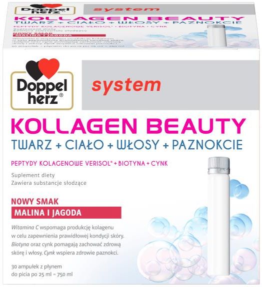 Kolagen Beauty 30 x 25 ml Smak malina jagoda Suplement diety 2,5 g bioaktywnych peptydów kolagenowych VERISOL® w jednej ampułce Działanie bioaktywnych peptydów kolagenowych VERISOL® potwierdzone badaniami naukowymi Witaminy i składniki mineralne, które pomagają zadbać o naturalne piękno skóry od wewnątrz O owocowym smaku malina i jagoda, wygodna forma ampułek z kolagenem do picia Działanie Doppelherz system KOLLAGEN BEAUTY to kolagen do picia, który powstał z myślą o aktywnych kobietach. Bogata formuła produktu o owocowym smaku maliny i jagody została opracowana w poręcznych, pojedynczych ampułkach. Nasz produkt to gotowy kolagen do picia (bez potrzeby rozcieńczania w innych płynach). Efekt działania kolagenu VERISOL® - bioaktywnych peptydów kolagenowych został potwierdzony badaniami naukowymi. Doppelherz system KOLLAGEN BEAUTY zawiera kolagen VERISOL® oraz starannie dobrane składniki, które pomagają zadbać o naturalne piękno skóry od wewnątrz: Witamina C wspomaga produkcję kolagenu w celu zapewniania prawidłowej kondycji skóry. Ponadto pomaga w ochronie komórek przed stresem oksydacyjnym. Witamina A, biotyna i cynk pomagają zachować zdrową skórę. Miedź pomaga w utrzymaniu prawidłowej pigmentacji skóry i prawidłowego stanu tkanek łącznych. Dodatkowo preparat zawiera ekstrakt z jagód Acai. Witamina E pomaga w ochronie komórek przed stresem oksydacyjnym. Dla kogo? Z wiekiem skóra staje się coraz cieńsza i mniej jędrna. Spowodowane jest to, między innymi, zmniejszającą się ilością kolagenu w skórze i utratą elastyczności. Nie pozwól skórze stracić naturalnego piękna i zadbaj o zdrowy wygląd skóry z Doppelherz system KOLLAGEN BEAUTY! Z myślą o aktywnych kobietach bogata formuła produktu o owocowym smaku maliny i jagody została opracowana w poręcznych, pojedynczych ampułkach. Stanowi idealne rozwiązanie dla aktywnych osób, ponieważ nasz kolagen jest gotowy do picia (bez potrzeby rozcieńczania w innych płynach). Sposób użycia Zawartość 1 ampułki z płynem (25 ml) spożyć raz dziennie. Przed użyciem wstrząsnąć. Kolegen do picia. Produkt gotowy do spożycia bezpośrednio z ampułki bez konieczności rozcieńczania w innych płynach. Składniki woda, sok z gruszki, kolagen VERISOL® (peptydy kolagenowe), kwas: kwas cytrynowy, ekstrakt z jagód Acai, kwas L-askorbinowy, substancja zagęszczająca: guma ksantanowa, L-askorbinian sodu, aromat, substancja konserwująca: benzoesan sodu, substancja konserwująca: sorbinian potasu, cytrynian cynku, substancja słodząca: cyklaminian sodu, octan DL-alfa tokoferylu, substancja słodząca: sukraloza, substancja słodząca: sacharynian sodu, glukonian miedzi (II), beta-karoten, D-biotyna. Kolagen w produkcie Doppelherz system Kollagen Beauty powstał z połączenia kolagenów typu I i III pochodzenia zwierzęcego – wieprzowego o masie cząsteczkowej nie przekraczającej 2000 Daltonów. Składniki, 1 ampułka, % RWS* Kolagen VERISOL®, 2,5 g, --- Ekstrakt z jagód Acai, 100 mg, --- Witamina C, 80 mg, 100% Cynk, 5 mg, 50% Witamina E, 3 mg, 25% Miedź, 0,15 mg, 15% Witamina A, 160 µg, 20% Biotyna, 150 µg, 300% *% RWS - Referencyjne Wartości Spożycia. Masa netto 30 x 25 ml Suplementy diety nie mogą być stosowane jako substytut (zamiennik) zróżnicowanej diety ani zdrowego trybu życia. Nie należy przekraczać zalecanej porcji produktu do spożycia w ciągu dnia. Suplementy diety powinny być przechowywane w sposób niedostępny dla małych dzieci. Przed zastosowaniem produktu sugerujemy zapoznanie się z dokładnymi informacjami podanymi na opakowaniu lub załączonej ulotce. Warunki przechowywania Przechowywać w szczelnym opakowaniu. W suchym i chłodnym miejscu, w sposób niedostępny dla dzieci. Chronić przed światłem. Producent Queisser Pharma Poland Sp. z o.o. ul. Domaniewska 39 02-672 Warszawa
