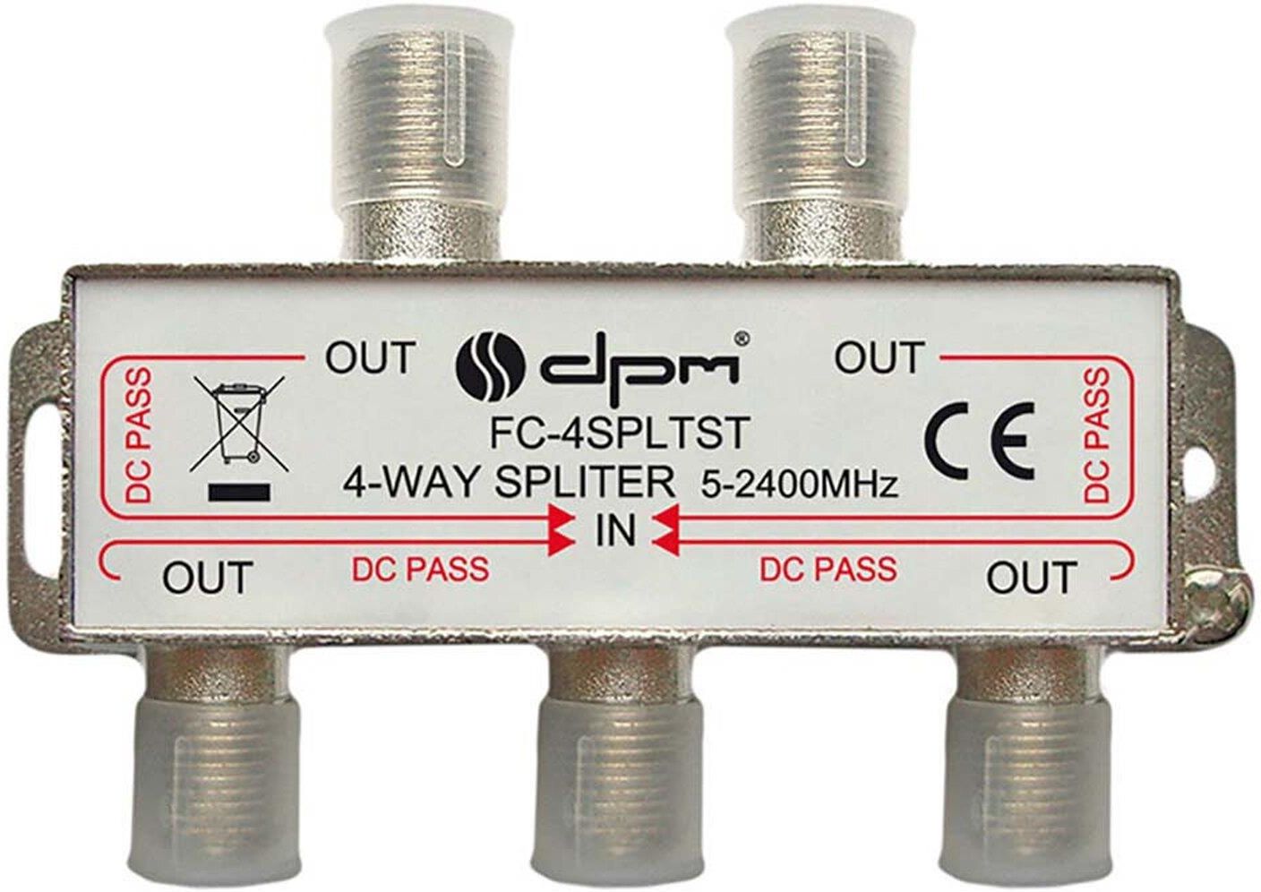 Splitter - rozdzielacz sygnału telewizyjnego z anteny DVB-T lub satelitarnej na 4 odbiorniki. Ma 1 wejście typu F i 2 wyjścia typu F. Przystosowany do anten ze wzmacniaczami - przesył napięcia z zasilacza antenowego. Zakres częstotliwości: 5 - 2400 MHz. Obudowa metalowa.