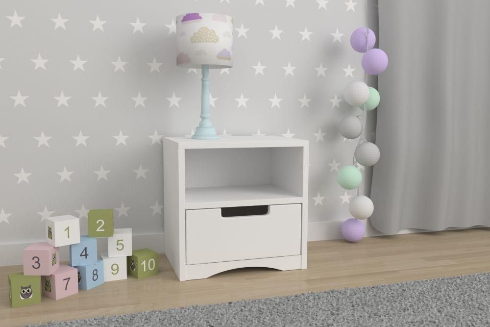 Szafka nocna CLASSIC to niewielkich wymiarów mebel wykonany z grubej 18 mm laminowanej płyty meblowej oraz płyty MDF lakierowanej ekologicznymi farbami. Szafka posiada pojemną szufladę na prowadnicach kulkowych oraz półkę do przechowywania drobnych przedmiotów.