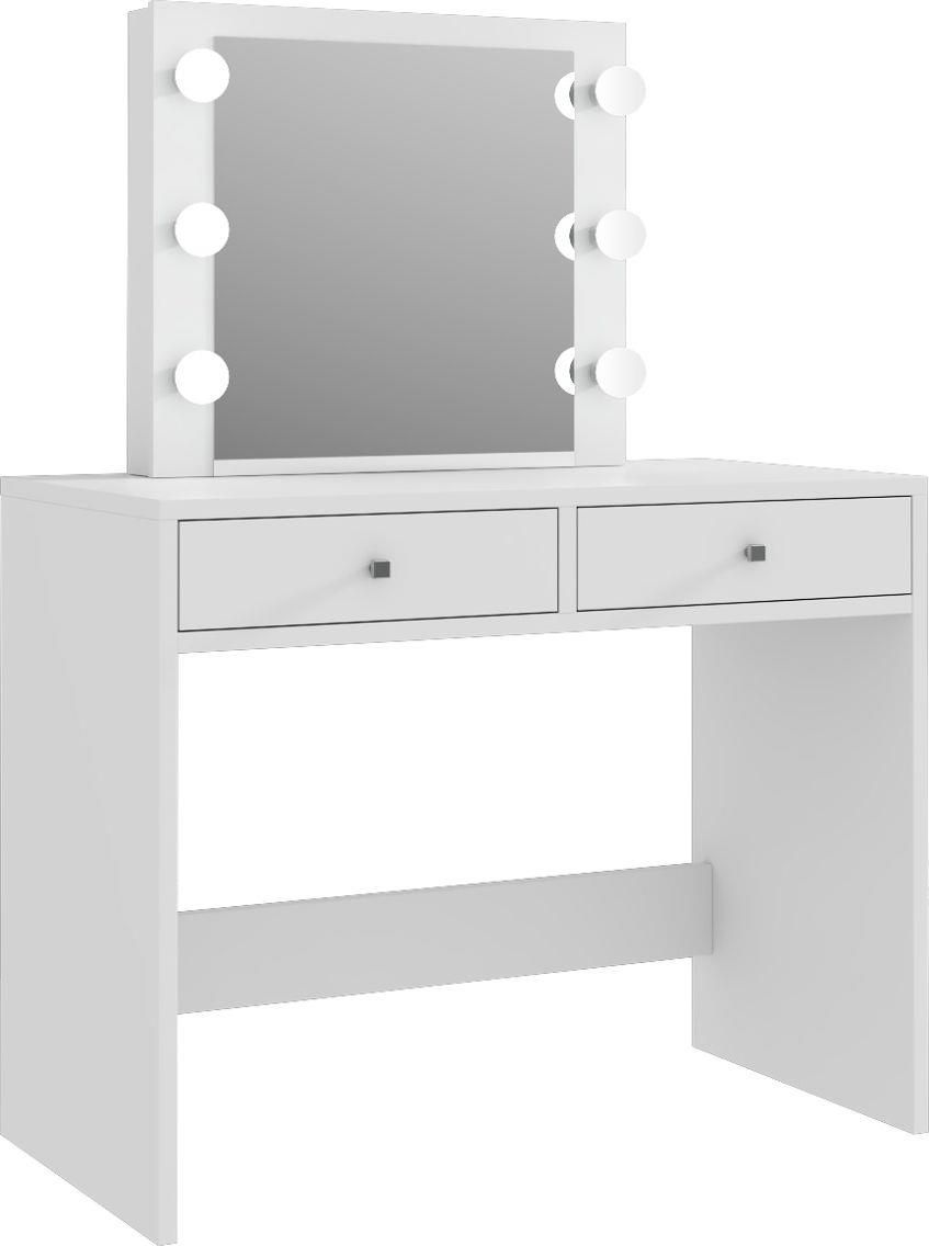 TOALETKA KOSMETYCZNA Z LUSTREM MEGA 6 LED BIAŁA Półprofesjonalna toaletka kosmetyczna w stylu Hollywood. Niezbędnik każdej kobiety, chcącej mieć swoją własną przestrzeń w domu, czy mieszkaniu. Może stanowić również wyposażenie profesjonalnego studia kosmetycznego. Dwie szuflady pomieszczą wszelkie niezbędne do makijażu akcesoria. Żarówki LED w białej, neutralnej barwie, sprawią, że wykonanie makijażu będzie łatwiejsze i przyjemniejsze. * Taboret nie wchodzi w skład zestawu, dostępny jest na pozostałych naszych aukcjach. __________________________________ Toaletka kosmetyczna Mega 6 LED z lustrem i żarówkami Kolor: biały mat Wyprodukowana w Polsce Wykonana z wysokiej jakości płyty laminowanej o grubości 18mm odpornej na ścieranie i zarysowania, oklejona obrzeżem ABS o grubości 0,6mm 2 pojemne szuflady Wygodny blat Lustro z oświetleniem LED w barwie białej neutralnej Dodatkowe informacje W zestawie z instrukcją i niezbędnymi akcesoriami Toaletka do samodzielnego montażu __________________________________ LUSTRO Wokół lustra znajduje się aż 6 żarówek LED w najlepszej do robienia profesjonalnego makijażu barwie - białej neutralnej, zapewniającej idealne doświetlenie skóry. Włącznik światła znajduje się z boku lustra - jest intuicyjny w obsłudze, dyskretnie schowany. Do toaletki poprowadzony jest kabel o długości ok. 180cm z wtyczką typu 'plug&play'. Wymiary lustra to 69cm szerokości, 57m wysokości, 10cm głębokości. Elementy instalacji elektrycznej oraz żarówki posiadają certyfikat CE. Barwa światła: Neutralna Kolor: Biały Kształt bańki: Kulisty Temperatura barwowa: [K]4000 Żarówka energooszczędna, nienagrzewająca się __________________________________ Wymiary toaletki __________________________________ Dostępne kolory 1. Biały