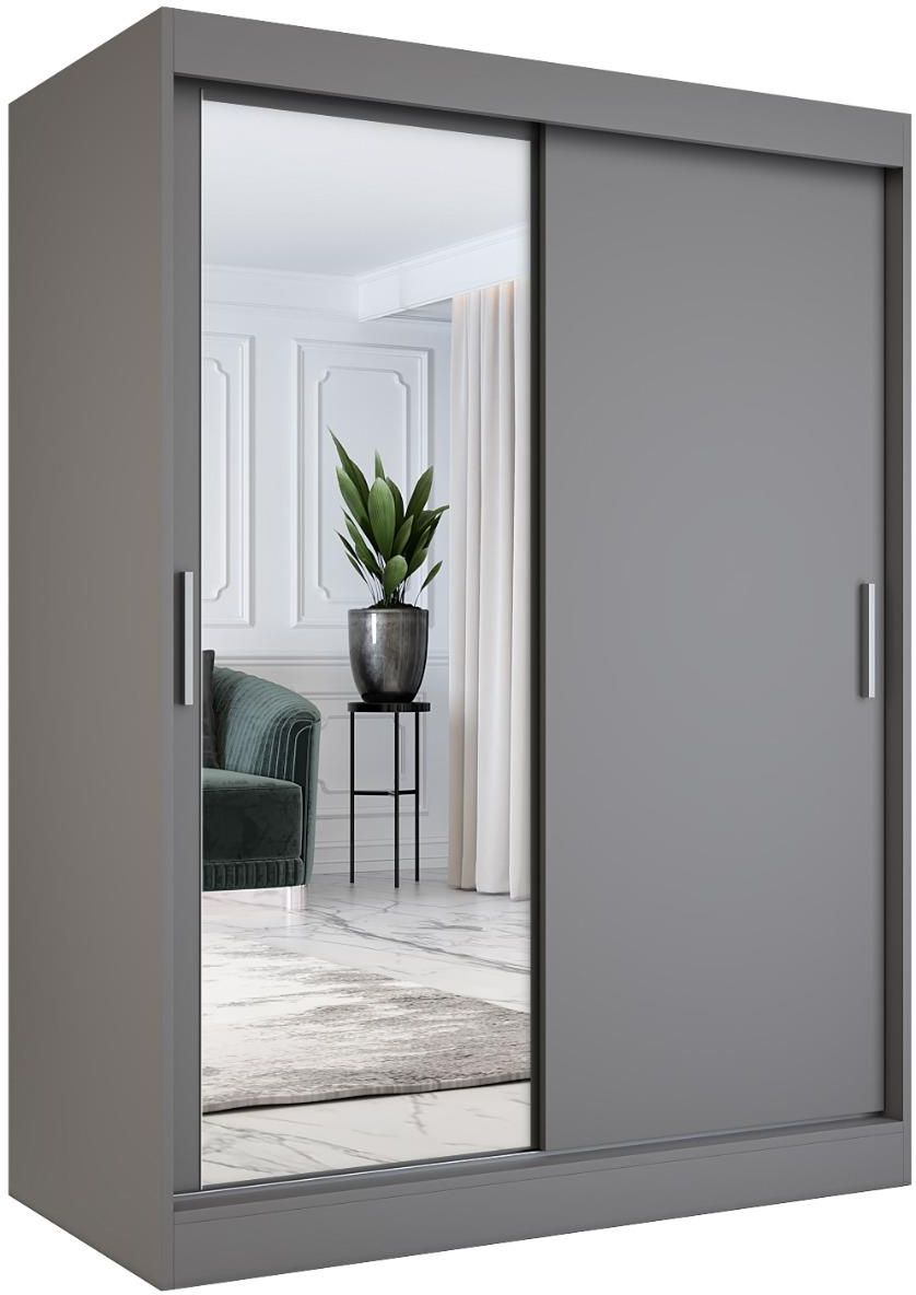 Szafa przesuwna MODUO COMFORT 150 antracyt to elegancka i nowoczesna szafa do sypialni lub salonu, która posiada gładki front i lustro oraz dwie konfiguracje wnętrza na ubrania letnie i zimowe.