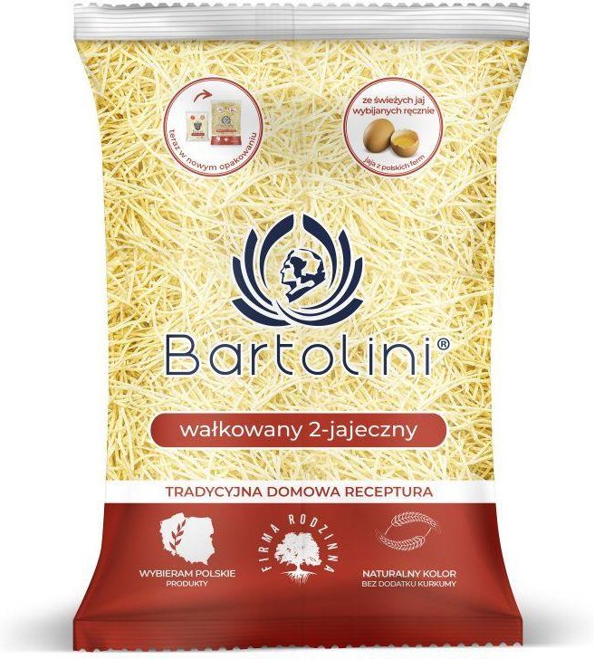 BARTOLINI Makaron 2-jajeczny Krajanka Cienka 400g Bartolini 2-jajeczny to makarony inspirowane polską tradycją kulinarną. Ich skład oraz rzemieślnicze metody wytwarzania nawiązują do receptur stosowanych od lat na ziemiach polskich. Ich lekko chropowata powierzchnia charakteryzująca również makarony wyrabiane własnoręcznie w domowym zaciszu, to zasługa specjalnych metod wytwarzania i suszenia. To dzięki niej makaron ten doskonale chłonie sosy i zupy, lepiej trzyma się łyżki, nie skleja się i znacznie zwiększa swą objętość po ugotowaniu. Nie zawiera masy jajowej, proszku jajecznego ani kurkumy. Jego naturalny, słoneczny kolor to to zasługa prostej, domowej receptury: tylko mąka, woda i świeże jaja z lokalnej fermy wybijane przez nas każdego dnia. Tabela wartości odżywczych: Wartość odżywcza w 100 g ugotowanego makaronu: Wartość energetyczna – 596 kJ (141 kcal) Tłuszcz – 0,7 g w tym kwasy tłuszczowe nasycone – 0,2 g Węglowodany - 28 g w tym cukry < 0,5 g Błonnik– 1,6 g Białko – 5,1 g Sól - 0,0 g Składniki: Mąka makaronowa pszenna, mąka z pszenicy durum, jaja świeże 9%. Czas gotowania: 4-5 min Sposób przechowywania: makaron przechowywać w miejscu suchym i przewiewnym. Masa netto: 400g Termin przydatności: 3 lata Bartolini to polska, rodzinna manufaktura z Mazowsza zajmująca się produkcją makaronów już od 25 lat. Firma oferuje szeroki asortyment makaronów w różnych wariantach smakowych, kolorystycznych oraz ciekawych kształtach. Bogate doświadczenie, nieustanny rozwój technologiczny, pasja oraz najwyższej klasy surowce pozyskiwane od zaufanych dostawców, są gwarancją uzyskania dobrego produktu będącego połączeniem innowacyjności z bardzo wysoką jakością.
