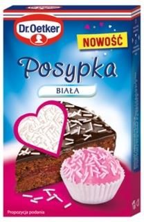 Dr. Oetker POSYPKA BIAŁA cukrowa 80 g Uwielbiasz proste w użyciu i efektowne dekoracje? Wypróbuj nowej, eleganckiej posypki BIAŁEJ. Dekoracja cukrowa idealnie sprawdza się do dekoracji ciast i deserów. Zastosowanie: do dekoracji ciast,lodów,deserów i gofrów. Polewy i lukry należy dekorować przed ich zastygnięciem. Kremy i bitą śmietanę najlepiej dekorować bezpośrednio przed podaniem. Baw się i dekoruj z fantazją swoje ciasta i desery Posypka cukrową. Masa netto: 80 g
