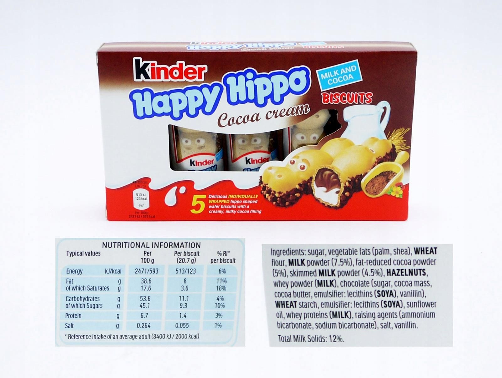 Kinder Happy Hippo Cocoa to niezwykłe ciasteczka w kształcie sympatycznego hipopotama, które cieszą się popularnością na całym świecie. To nie tylko przekąska, to małe dzieło sztuki cukierniczej, które łączy w sobie smakowitą harmonię czekolady i mleka. Wnętrze tych chrupiących ciasteczek skrywa dwie warstwy - jedną z delikatną czekoladą, a drugą z kremowym mlekiem. Dodatkowo, spód każdego ciastka jest maczany w czekoladzie i obsypany drobnymi, chrupiącymi kawałkami, nadając mu niezapomnianej tekstury. Kinder Happy Hippo Cocoa to doskonała przekąska na każdą okazję. Ciesz się nią w podróży, w pracy, czy jako słodki akcent w codziennym życiu. Przywróć sobie uśmiech na twarzy dzięki temu wyjątkowemu smakowemu doświadczeniu. Nie zwlekaj! Zamów teraz Kinder Happy Hippo Cocoa i pozwól sobie na chwilę słodkiego relaksu. Odkryj smak, który pokochasz! Masa netto: 103,5 g Składniki:CUKIER, TŁUSZCZE ROŚLINNE (PALMOWY, SHEA), MĄKA PSZENNA, MLEKO W PROSZKU (7,5%), KAKAO W PROSZKU O OBNIŻONEJ TŁUSZCZU (5%), ODTŁUSZCZONE MLEKO W PROSZKU (4,5%), ORZECHY LASKOWE, SERWATKA W PROSZKU (MLEKO), CZEKOLADA (CUKIER, MASA KAKAOWA, MASŁO KAKAOWE, EMULSJONATOR: LECYTYNY (SOJA), WANILINA), SKROBIA PSZENNA, Emulgator: LECYTYNY (SOJA), OLEJ SŁONECZNIKOWY, BIAŁKA SERWATKOWE (MLEKO), SUBSTANCJE SPULCHNIAJĄCE (WĘGLAN AMONU, WODOGÓRNIAN SODU), SÓL, WANILINA.