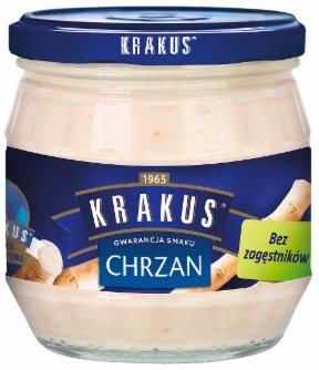 Krakus Chrzan 180g Bez zagęstników Zachowuje wyrazisty smak dzięki wysokiej zawartości tartego chrzanu. Łączy kremową konsystencję z wyczuwalnymi chrzanowymi wiórkami. Swą wyrafinowaną ostrością wzbogaca smak mięs i wędlin. Składniki: korzeń chrzanu (60%), woda, olej rzepakowy, ocet spirytusowy, …