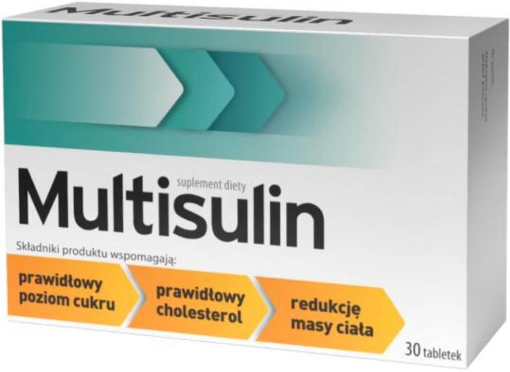 Składniki: Woda; substancja zagęszczająca: ksylitol; ekstrakt z melisy (Melissa officinalis); ekstrakt z rumianku (Matricaria recutita); substancja zagęszczająca: guma ksantanowa; substancja konserwująca: sorbinian potasu, kwas: kwas jabłkowy, chlorowodorek pirydoksyny (witamina B6); naturalny aromat melisy. Składniki w 1 tabletce: wyciąg z cynamonowca 180 mg, polikozanol 6,6 mg, wyciąg z liści Gumar 400 mg, w tym kwas gymnenowy 410 mg, wyciag z liści morwy białej 200 mg, chrom 20 ug 100%, Witamina B6 1,4 mg 100%, Witamina B12 2,5 ug 100%, Wyciąg z opuncji figowej 25 mg. *Referencyjna Wartość Spożycia. Masa netto: 30 tabletek Właściwości: Multisulin zawiera polikozanol - mieszaninę długołańcuchowych alkoholi izolowanych z wosku trzciny cukrowca lekarskiego. W składzie znalazł się wyciąg z cynamonowca cejlońskiego i wyciąg z liści Gurmar, które wspomagają utrzymanie prawidłowego poziomu cukru we krwi. Wyciąg z cynamonowca wspiera produkcję cholesterolu frakcji HDL i utrzymanie prawidłowego poziomu lipidów. Wyciąg z opuncji figowej i Gymnema pomagają ograniczyć apetyt oraz wspomagają odchudzanie. Zalecane dzienne spożycie: 1 tabletka dziennie podczas posiłku. Przeciwwskazania: Nadwrażliwość na którykolwiek ze składników preparatu. W okresie ciąży i karmienia piersią przed zastosowaniem należy skonsultować się z lekarzem lub farmaceutą. Przechowywanie: Przechowywać w suchym miejscu. Chronić od światła i wilgoci. Przechowywać w temperaturze nie przekraczającej 25°C. Przechowywać w sposób niedostępny dla małych dzieci. Producent: AFLOFARM Partyzancka 133/151 95-200 Pabianice