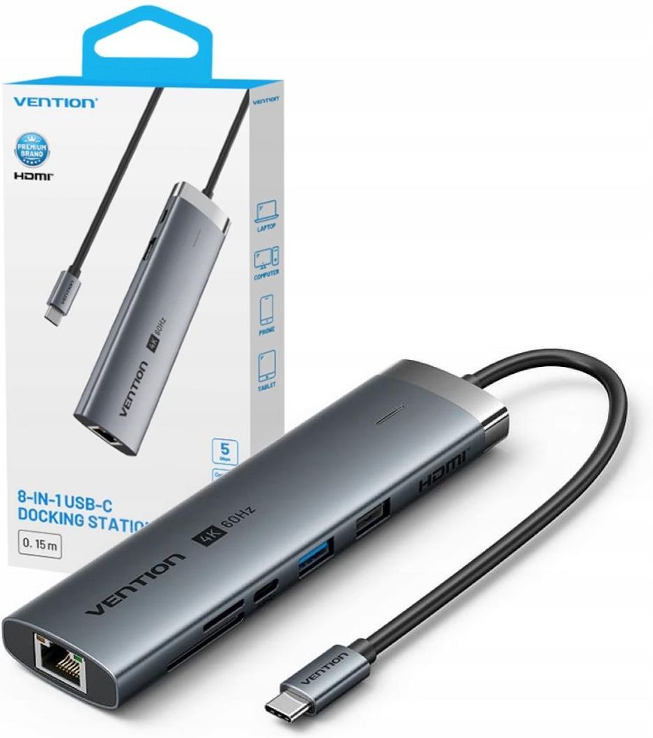 Stacja dokująca USB-C 9w1 Vention 4k 60hz 100w pd 0.15m Wielofunkcyjna stacja dokująca Vention 9w1 USB-C to kompaktowe centrum łączności stworzone z myślą o użytkownikach laptopów, którzy potrzebują wygodnego dostępu do wielu portów w jednym urządzeniu. Umożliwia szybkie przesyłanie danych, podłączenie kilku ekranów, akcesoriów i nośników pamięci, a jednocześnie ładuje komputer z mocą do 100 W. To praktyczne rozwiązanie do biura, domu i podróży – wszędzie tam, gdzie liczy się porządek i funkcjonalność. Funkcjonalność i możliwości - 9 portów w jednym urządzeniu Stacja Vention 9w1 oferuje komplet najczęściej używanych złączy: 1 × HDMI 4K 60Hz, 3 × USB 3.0, 1 × USB-C PD 100W (zasilanie laptopa), 1 × RJ45 Ethernet, 1 × czytnik kart SD, 1 × czytnik kart TF (microSD), 1 × port audio 3,5 mm. Zestaw ten pozwala podłączyć monitory, pamięci USB, sieć przewodową i słuchawki bez konieczności używania dodatkowych adapterów. Obsługa obrazu 4K 60Hz Port HDMI umożliwia przesyłanie obrazu w jakości Ultra HD 4K przy 60 Hz, co przekłada się na wyjątkową szczegółowość i płynność. To idealne rozwiązanie do pracy z grafiką, montażu wideo czy oglądania filmów w wysokiej rozdzielczości. Konstrukcja i wydajność - zasilanie Power Delivery 100 W Stacja obsługuje szybkie ładowanie Power Delivery 3.0 z mocą do 100 W, umożliwiając zasilanie nawet wymagających laptopów. Inteligentny system automatycznie reguluje napięcie i chroni urządzenia przed przeciążeniem oraz przegrzaniem. Wysoka prędkość transferu danych Porty USB 3.0 oferują prędkość przesyłu do 5 Gb/s, co umożliwia szybkie kopiowanie dużych plików i obsługę kilku akcesoriów jednocześnie bez spadku wydajności. Design i wykonanie - kompaktowa, lekka konstrukcja Obudowa wykonana z aluminiowego stopu skutecznie odprowadza ciepło i zapewnia trwałość przy codziennym użytkowaniu. Niewielkie wymiary i przewód o długości 0,15 m pozwalają na wygodne podłączenie stacji nawet w ograniczonej przestrzeni roboczej. Nowoczesne, eleganckie wykończenie Matowa powierzchnia w odcieniu grafitowego srebra dobrze komponuje się z laptopami i akcesoriami biurowymi, nadając stanowisku pracy profesjonalny wygląd. Zastosowanie - dla profesjonalistów i użytkowników domowych Stacja dokująca Vention 9w1 sprawdza się w pracy biurowej, przy tworzeniu prezentacji, transmisjach online czy domowej rozrywce. Umożliwia rozbudowę laptopa o pełen zestaw portów, eliminując konieczność korzystania z kilku osobnych adapterów. Plug and Play - bez instalacji sterowników Urządzenie działa natychmiast po podłączeniu i nie wymaga konfiguracji ani oprogramowania. Jest kompatybilne z systemami Windows, macOS, Linux i Chrome OS, co czyni je uniwersalnym rozwiązaniem dla różnych środowisk pracy. Specyfikacja Producent: Vention Model: TGVHB Rodzaj: Stacja dokująca USB-C (hub 9-w-1) Złącza: 1× HDMI (4K @ 60 Hz) 3× USB-A 3.0 1x USB-A 2.0 1× USB-C (Power Delivery do 100 W) 1× RJ45 (Ethernet 1 Gb/s) 1× gniazdo kart SD 1× gniazdo kart microSD 1× audio 3,5 mm Długość przewodu: 0,15 m Kompatybilność: Laptopy, tablety, smartfony z USB-C Obsługiwane systemy: Windows, macOS, Linux, Android Funkcje dodatkowe: Plug & Play, szybki transfer danych (5 Gb/s), ładowanie PD Zasilanie: USB-C Power Delivery 100 W Rozdzielczość wideo: Do 4K @ 60 Hz Kraj pochodzenia: Chiny