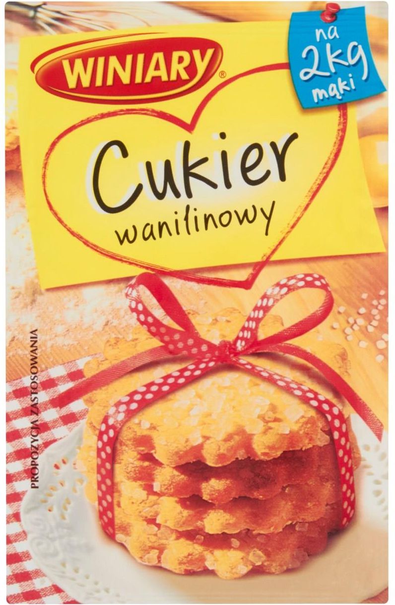 Właścicielem znaku towarowego jest Société des Produits Nestlé S.A. Przechowywać w suchym i chłodnym miejscu. Cukier wanilinowy Winiary idealnie nadaje się jako dodatek do ciast i deserów, nadając im wyjątkowy smak i aromat. Doskonały do kruchego ciasta zarówno jako składnik, jak i dekoracja, nadaje charakteru serowym nadzieniom do naleśników i pierogów, a także podkreśla smak sernika i prażonych orzechów. Winiary to marka, która od lat jest gwarancją sukcesu w kuchni. Jej produkty inspirują do przygotowywania znanych od pokoleń, tradycyjnych dań, jak również tych we współczesnym wydaniu. Zupy, majonezy, buliony, sosy, Pomysły na…, dania instant, przyprawy, galaretki, kisiele czy budynie - w sumie ponad 230 różnych produktów, dzięki którym można szybko i prosto przygotować pyszny, domowy posiłek. Pomysły na dania na każdy dzień i okazję, inspiracje do eksperymentowania w kuchni, liczne porady i ciekawostki marka Winiary zebrała na www.winiary.pl, która jest jedną z najpopularniejszych stron kulinarnych w Polsce. Winiary to marka, którą Polacy znają, cenią i której ufają, czego dowodem są liczne nagrody m.in. Kryształowe Godło Marki Godnej Zaufania, a także prestiżowy tytuł Najmocniejszej Marki Roku przyznawany przez redakcję „Rzeczpospolitej”. Nestlé Jedz smacznie, żyj zdrowo Sposób przygotowania Kruche ciasteczka: Potrzebujesz: 300 g (2 szklanki) mąki pszennej, 200 g (1 kostka) masła, 100 g (2/3 szklanki) cukru pudru, 2 łyżeczki jogurtu naturalnego, 2 żółtka, 1 Cukier wanilinowy Winiary 32 g, 1 łyżeczkę Proszku do pieczenia Winiary. Opcjonalnie: 100 g pokruszonych płatków migdałów lub startą skórkę z dwóch cytryn. Do dekoracji: pozostałe białko, 1 Cukier wanilinowy Winiary 32 g. 1. Mąkę przesiej, dodaj cukier puder, 1 cukier wanilinowy, proszek do pieczenia, pokrojone masło, 2 żółtka, jogurt i dodatki (migdały lub skórkę). Całość dokładnie wygnieć. 2. Stolnicę podsyp mąką i rozwałkuj ciasto na grubość ok. 0,5 cm i wykrój ciasteczka. Ciasteczka posmaruj białkiem i posyp Cukrem wanilinowym Winiary. 3. Piekarnik rozgrzej do 180°C. Blachę wyłóż pergaminem, ułóż ciasteczka i włóż do piekarnika. Piecz 15 min. Kalorie 160 kcal na 1 porcję (50 g) Czas 15 min Porcje 14 szt. Szukaj więcej przepisów i inspiracji na winiary.pl Cukier wanilinowy