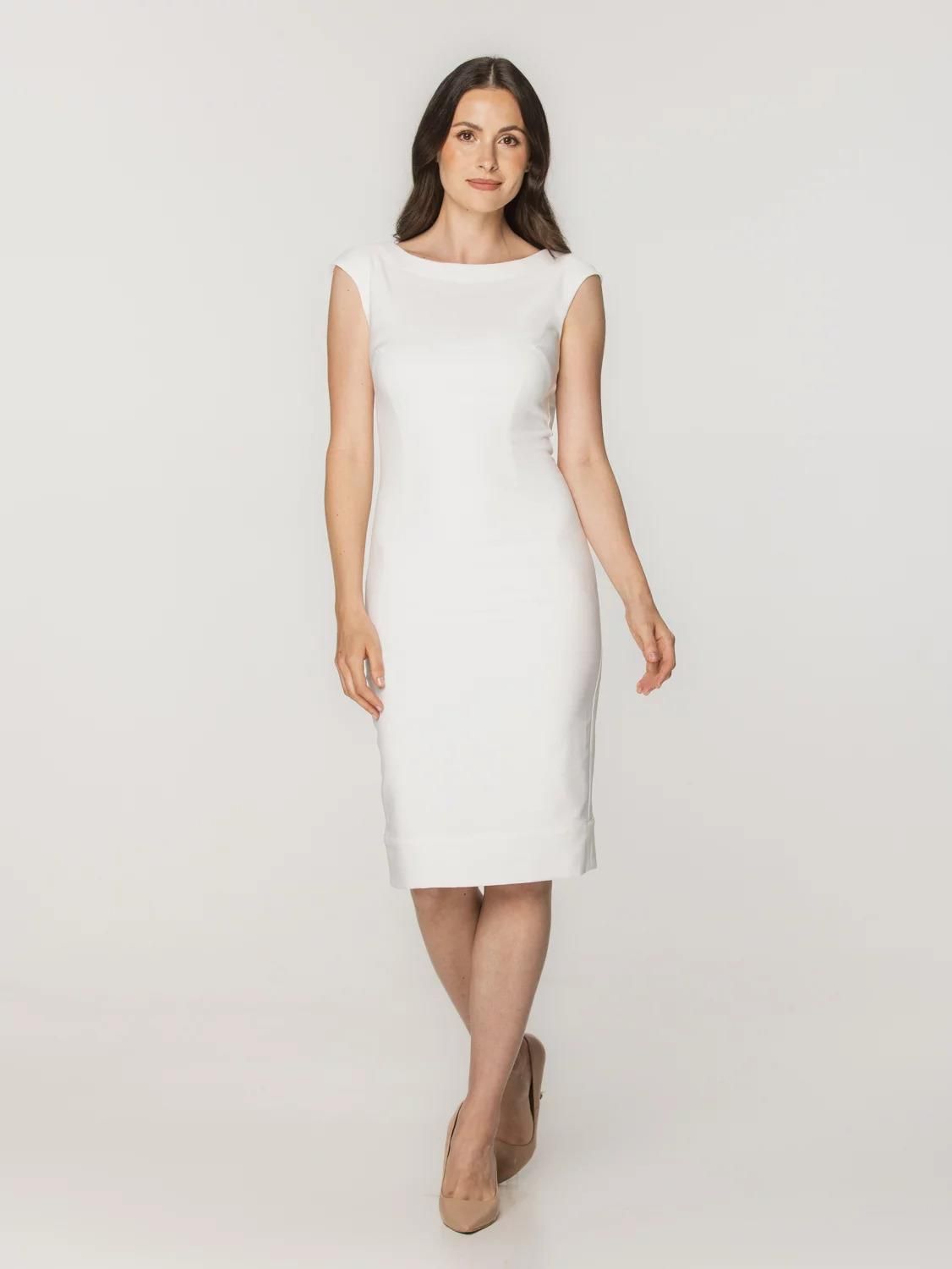 Dopasowana sukienka z kokardą Dopasowana sukienka z zakrytym dekoltem i odkrytymi plecami. Jej długość zapewnia komfort noszenia, a czarno-białe detale dodają szyku i uroku. Sukienka dodatkowo posiada kokardę na plecach, która jest subtelnym, ale efektownym akcentem, który dodaje sukience wyjątkowości. Sprawdzi się jako elegancki strój na wyjątkowe okazje jak Komunie, urodziny czy wesela. Kolor główny: biała o gładkiej fakturze Rodzaj sukienki: dopasowana, długość MIDI Skład tkaniny wierzchniej: 83% poliester, 12% wiskoza, 5% elastan Skład podszewki: 98% poliester, 2% elastan Posiada ukryty suwak na plecach Gwarancja: 24 m-ce Uszyta w Polsce