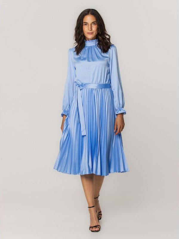 Sukienka ze stójką i plisowaniem Elegancka sukienka MIDI ze stójką, długimi rękawami zakończonymi falbanką, plisowaną spódnicą oraz dodatkowym paskiem w zestawie. Zwiewna sukienka z marszczoną stójką, zabudowanym dekoltem i paskiem w talii pięknie układa się na ciele, sprawiając, że sylwetka staje się lekka i młodzieńcza. Doskonała na koktajlowe przyjęcia, spotkania czy dzień w biurze. Kolor główny: błękitna o gładkiej, lekko połyskującej fakturze Długość rękawów: długie z falbanką Rodzaj sukienki: plisowana o luźnym kroju, długość MIDI Skład tkaniny wierzchniej: 100% satyna poliestrowa Skład podszewki: 100% wiskoza Wyprodukowano w Polsce Gwarancja: 24 m-ce