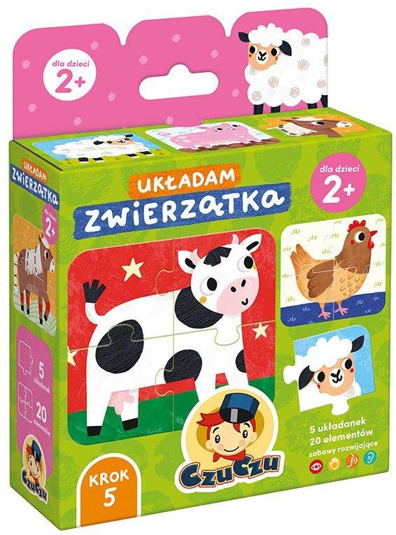 CzuCzu Układam Zwierzątka dla dzieci 2+ puzzle 4 elementy Poznajcie wesołych mieszkańców wiejskiego gospodarstwa! Każdy obrazek składa się z 4 puzzli, dlatego zestaw doskonale znakomicie sprawdzi się u maluchów, które początek układania mają już za sobą. Wesołe kolorowe zwierzątka zachęcają dzieci do łączenia elementów i inspirują do mnóstwa zabaw. Pojedźmy razem na wieś! zestaw zawiera: 5 układanek (20 puzzli) elementy są wykonane z grubej, trwałej tektury wymiary układanki: 14 x 12,5 cm wymiary pudełka: 13,5 x 18 x 5 cm odpowiednie dla dzieci w wieku 2+ wyprodukowano w Polsce pomysł na edukacyjny prezent doskonałe pierwsze kilkuelementowe puzzle Przepis na dobrą zabawę Układam zwierzątka od CzuCzu to świetny pomysł na edukacyjny prezent dla malucha gotowego na układanie trudniejszych puzzli. Możecie zacząć od rozdzielenia elementów poszczególnych układanek - pomogą w tym kolorowe rewersy. Możesz połączyć 3 elementy i poprosić dziecko o dołożenie ostatniego. Sprawdź, czy maluch zna wszystkie zwierzątka. Nazywajcie kolory i detale, naśladujcie odgłosy i ruchy bohaterów ilustracji i wymyślajcie o nich opowieści. Radość odkrywania Maluch codziennie chłonie nową wiedzę, co w naturalny sposób przychodzi mu przez zabawę. Codziennie poznaje nowe słowa i staje się coraz bardziej samodzielny. Układanie puzzli rozwija małą motorykę i wyobraźnię, inspiruje do poszerzania słownictwa i wyobraźni, a zabawa w dokładanie elementów to sposób na doskonalenie spostrzegawczości i pamięci. Edukacyjny zestaw z ulubionymi zwierzątkami znakomicie sprawdzi się jako prezent dla dwulatka. CzuCzu jest polską marką, którą tworzymy od 2009 r. Książeczki, gry, puzzle i zabawki edukacyjne opieramy na prostych rozwiązaniach, które dają rodzicom i dzieciom przestrzeń do inicjowania własnych pomysłów na zabawę. Podążamy za dziećmi, wspierając ich rozwój motoryczny, emocjonalny i społeczny. Wierzymy, że silna więź, która rozwija się między dzieckiem a rodzicem, jest najważniejszym fundamentem jego życia. Chcemy, żeby CzuCzu wzmacniało tę wyjątkową relację, sprawiając jednocześnie ogromną przyjemność ze wspólnie spędzanego czasu. Nasze książeczki i zabawki odznaczają się najwyższą jakością wykonania i są dopracowane w najmniejszym szczególe. CzuCzu jest w całości produkowane w Polsce. Doceniają nas nie tylko dzieci i rodzice! Z dumą i radością dajemy znać, że w 2020 roku za całokształt naszych działań edukacyjnych dostaliśmy Nagrodę Specjalną w XVIII edycji Konkursu Świat Przyjazny Dziecku organizowanego przez Komitet Ochrony Praw Dziecka.