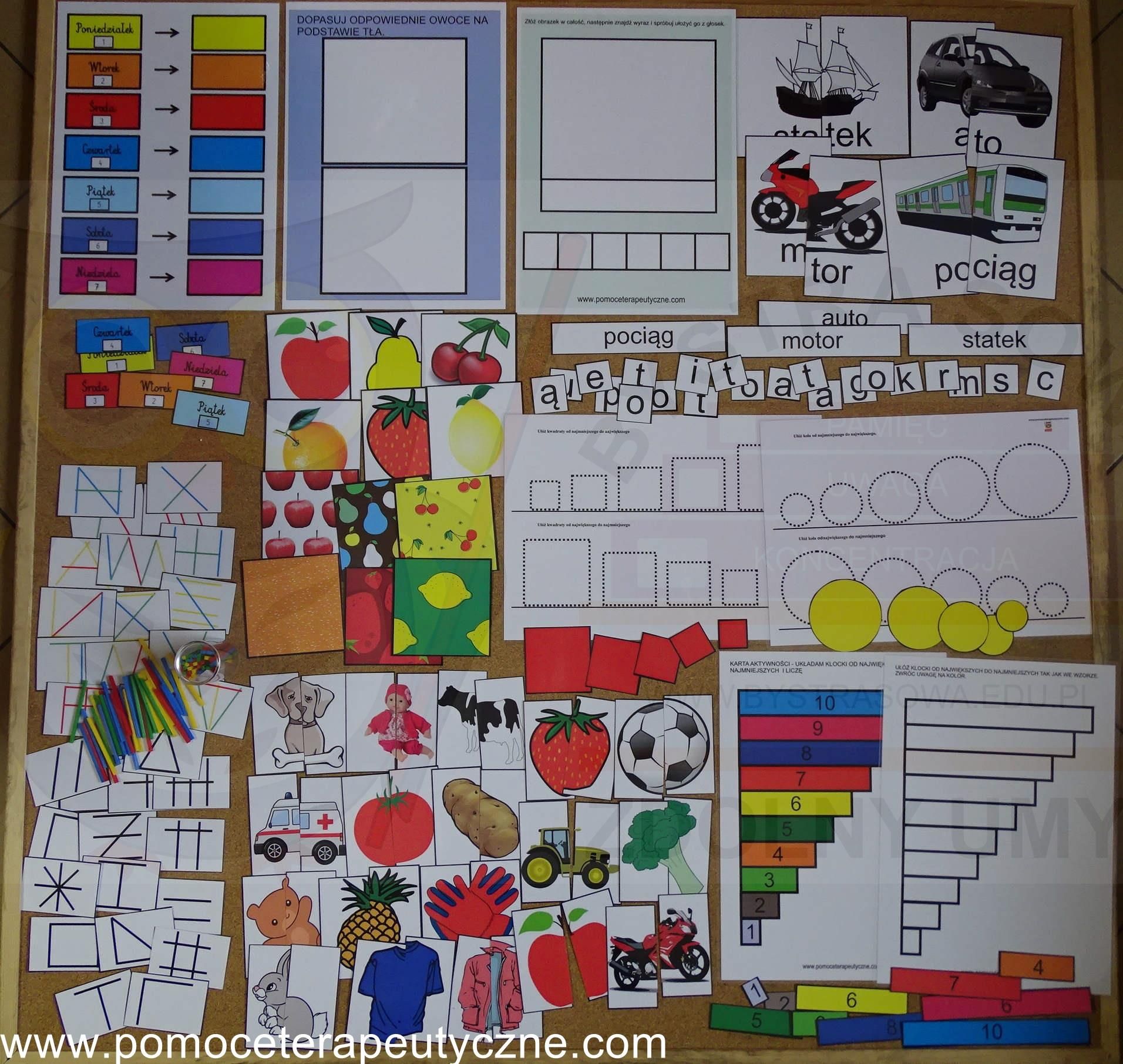 Poznaję otaczający mnie świat - zestaw 5 Zestawy z pewnością przydadzą się w pracy w domu z dzieckiem, do pracy nauczycielom edukacji przedszkolnej, nauczycielom wspomagającym , terapeutom dzieci autystycznych, z zaburzeniami uwagi koncentracji, percepcji wzrokowej, logicznego myślenia. Przeznaczony do pracy indywidualnej jak i małej grupowej. Szerokie pole ćwiczeń, począwczy od rozwijania percepcji wzrokowej, umiejętności matematyczne, ćwiczenia koncentracji uwagi, motoryki małej, po rozwijanie umiejętności czytania i rozwijania mowy.Opis zestawów, które wchodzą w skład :1. Zestaw pomocy "Uczę się czytać- dobieram obrazek, wyraz i głoski".Zestaw pomocy terapeutycznych mający na celu rozwijanie umiejętości czytania. Rozwija wiele innych procesów poznawczych takich jak: percepcja wzrokowa ( łączenie obrazków w całość), percepcję słuchową ( wymawiamy sylaby, głoski, łączymy w jeden wyraz), oraz rozwijanie mowy. W zestawie mamy zalaminowaną kartę aktywności w formacie A4 do nakładania wszystkich obrazków oraz zestaw zalaminowanych elemementów ( napisów do czytania globalnego 4 szt), ( obrazków podzielonych na pół - sylaby ( 8 szt). oraz głosek ( 21 szt. ). Zadaniem dziecka jest dobranie na poczatku złączenie obrazka z dwóch części i przeczytanie wyrazu, następnie dobranie do niego odpowiedniego wyrazu. Ostatnim etapem jest złożenie z głosek wyrazu i jego przeczytanie :Zawartość zestawu: - 1 szt. zalaminowana karta aktywności w formacie A4 do nakładania obrazków - 4szt. zalaminowaych napisów do czytania globalnego -8 szt. zalaminowanych obrazków ( podzielonych na sylaby) -21 szt. zalaminowanyhc obrazków ( podzielonych na głoski)2. Zestaw pomocy "Puzzle 2 -elementowe"Zestaw składa się z 18 szt. zalaminowanych dużych obrazków pociętych na dwuelementowe części. przygotowanych pod kątem graficznym w różnych kategoriach: pojazdy, zwierzęta, zabawki, odzież, owoce, warzywa. Dzięki temu możemy nie tylko układać obrazki w całość,ale również rozwijać mowę, uczyć segregowania.Zawartość zestawu: - 18szt. zalaminowanych obrazków ( 36 szt. zalaminowanych części)3. Zestaw pomocy "Poznajemy dni tygodnia"Poznajemy dni tygodnia to pomoc terapeutyczna mająca na celu utrwalanie nazw dni tygodnia w odpowiedniej kolejności. Zestaw „Poznajemy dni tygodnia zawiera zalaminowaną kolorową kartę aktywności w formacie A4 , na której z lewej strony widoczne są już dni tygodnia, ułożone w odpowiedniej kolejności, z prawej zaś strony są puste pola do uzupełnienia przygotowanymi plakietkami z dniami tygodnia.Cele terapeutyczne: - poznanie dni tygodnia - rozwijanie mowy, pamięci, spostrzegawczości, koncentracji uwagiZawartość zestawu:- zalaminowaną kartę aktywności w formacie A4 do uzupełniania z dniami tygodnia - 7 szt. zalaminowanych kolorowych plakietek z dniami tygodnia4. Zestaw pomocy " Owocowa fantazja- dopasuj obrazek do tła"Owocowa fantazja- dopasuj obrazek do tła to propozycja ćwiczeń rozwijających percepcję wzrokową, logiczne myślenie. W zestawie zawarta jest zalaminowana karta aktywności do nakładania obrazków oraz obrazki symbolizujące owoce. Zadaniem dziecka jest odnalezienie odpowiedniego owocu i dopasowanie do tła.Zawartość zestawu: - zalaminowana karta aktywności w formacie A4 do nakładania obrazków - 12 szt. zalaminowanych dużych obrazków symbolizujących owoce i ich tła5.Zestaw pomocy "Uczę się liczyć - klocki od największego do najmniejszego"Zestaw pomocy terapeutycznych mających na celu rozwijanie umiejętności matematycznych w tym liczenia. Utrwalamy również kolory i ćwiczymy percepcję wzrokową ). W zestawie 2 szt. zalaminowanych kart aktywności ( jedna z nich to gotowy wzór, druga dotyczy ułożenie obrazków klocków wg wzoru). Do zestawu dołaczony zestaw obrazków klocków w różnej kolorystyce o różnej długości. każdy z nich podpisany cyfrą. Pierwsza propozycją ćwiczeń może być zadanie dotyczace ułożenia cyfr wg kolejności na karcie aktywności, zwracając uwagę na i ich kolor. W trudniejszej wersji dziecko dopasowuje klocki bez wzoru.Zawartość zestawu: 2 szt. zalaminowanych kart aktywności ( jedna kolora ze wzorem ) druga czarnobiała to nakładania obrazków ( format A4) 10 szt. zalaminowanych obrazków klocków od największego do najmniejszego oznaczonych cyframi6. Zestaw pomocy "Patyczkowe szaleństwo" wraz z zestawem patyczkówZestaw "Patyczkowe szaleństwo" to kolejna z ciekawych propozycji zajęć z dziećmi. Tym razem w innej formie niż zawsze. Do dyspozycji mamy 80 patyczków plastikowych w różnych kolorach oraz 16 kolorowych kart z rożnymi ustawieniami patyczków i 16 kart czarno- białych, wszystko zalaminowane. Zadaniem dziecka jest układanie takich samych wzorów co na obrazkach. Do kart ze wzorami czarno-białymi dziecko układa taki sam wzór z patyczków kreatywnych obojętnie z jakich kolorów, natomiast do kart kolorowych, dziecko układa wzór według kolorów. Oprócz tego można tworzyć też własne kompozycje. Doskonałe ćwiczenie na sprawność manualną, spostrzegawczość, motorykę małą .Zabawy z wykorzystaniem zestawu „Patyczkowe szaleństwo - Dziecko układa z patyczków taki sam wzór co widnieje na karcie czarno-białej - Układamy z patyczków taki sam wzór co na karcie kolorowej ( wg. kolorów) - Tworzymy różne kompozycje z patyczków ( wg. wzoru np. rodzica / terapeuty) - Tworzymy samodzielnie wymyślony wzór z patyczkówZawartość zestawu: 80 kreatywnych patyczków 16 szt. zalaminowanych kart czarno- białych z różnymi wzorami ułożenia od prostszych do trudnych 16 szt. zalaminowanych kart kolorowych z różnymi wzorami ułożenia od prostszych do trudnych7. Zestaw pomocy "Figurowa układanka"Zestaw zawiera 2 zalaminowane karty aktywności w formacie A4 z konturami kwadratów i kół od najmniejszego do największego i odwrotnie . W zestawie również elementy zalaminow