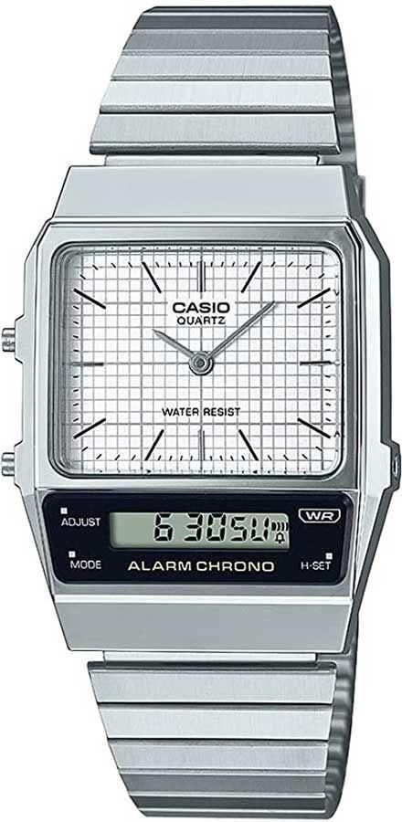 ZEGAREK UNISEX CASIO Vintage Dual Time AQ-800E-7A + BOX AQ-800E-7A OPIS: Mechanizm: kwarcowy Koperta i bransoleta ze stali szlachetnej Szkło akrylowe FUNKCJE: Wodoszczelność WR30 Automatyczny kalendarz - wyświetla dzień, miesiąc oraz dzień tygodnia Stoper (1/100s) Minutnik Alarm Tryb wyświetlania czasu 12h Funkcja dwóch stref czasowych umożliwia ustawienie drugiego czasu cyfrowego niezależnie od bieżącego czasu analogowego WYMIARY szerokość koperty: 32 mm grubość koperty: 9 mm szerokość paska: 18 mm maksymalny obwód: ok. 21,5 cm KOLORYSTYKA tarcza: biała / LCD koperta: srebrna bransoleta: srebrna Parametry Płeć: Damskie, Męskie Kształt tarczy: Prostokątny Mechanizm: Kwarcowy Pasek/bransoleta: Stal szlachetna Rodzaj tarczy: analogowo-cyfrowy Klasa wodoszczelności: WR30 Szkło: Akrylowe Funkcje: Budzik, Datownik, Minutnik / Timer, Stal nierdzewna, Stoper Kolor tarczy: Biały Długość towaru w centymetrach: 25 Szerokość towaru w centymetrach: 8 Wysokość towaru w centymetrach: 5 Waga gabarytowa w gramach: 166.67 Kolor koperty: Srebrny Konfigurator usługi grawerowania: true KOLOR PASKA: Srebrny Szerokość koperty (mm): 24 Grubość koperty (mm): 7 Szerokość paska/bransolety (mm): 14 Obwód maksymalny (mm): 215 Tłumaczenia: Angielski - Nazwa, Angielski - Opis długi