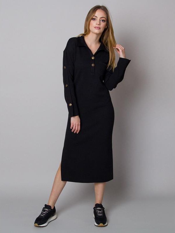 Sukienka dzianinowa Czarna sukienka o prostym kroju, z dużym kołnierzem i długim rękawem, rozpinanym dekoltem. Uszyta z elastycznej i prążkowanej dzianiny. Dekolt i rękawy rozpinane na całej długości ozdobione są dużymi złotymi guzikami. Niezwykle kobieca sukienka ołówkowa za kolano, którą można …