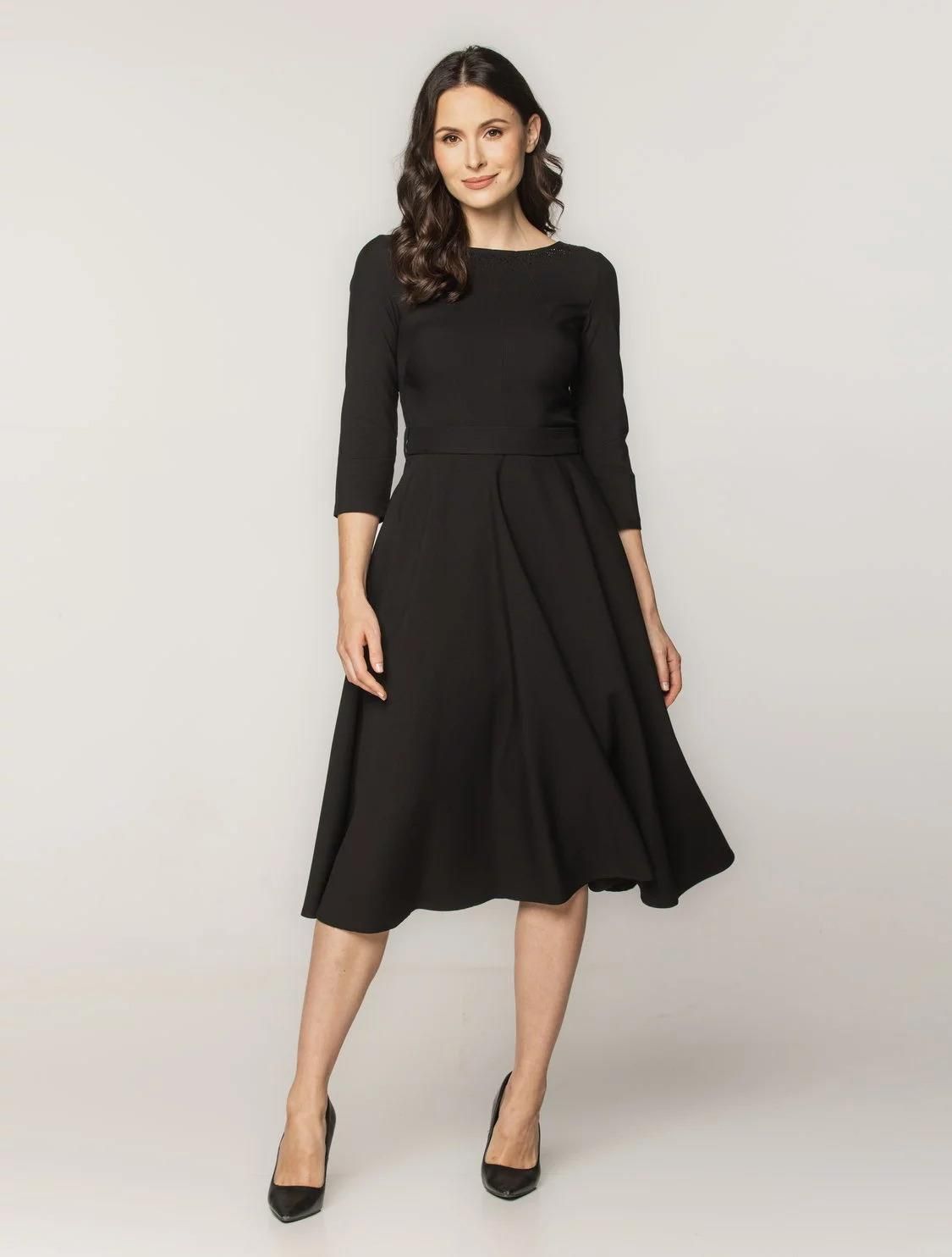 Rozkloszowana sukienka MIDI Elegancka sukienka MIDI z rozkloszowanym dołem i okrągłym dekoltem (typu łódka). Sukienka posiada rękaw 3/4 i jest zapinana na plecach za pomocą zamka błyskawicznego. Charakterystycznymi cechami tego modelu są dwie kieszenie oraz pasek, który można wiązać na wiele sposobów. Sukienka świetnie kamufluje niedoskonałości figury, a dzięki paskowi w talii tworzy piękną, klepsydrową sylwetkę. Kolor główny: czarna o gładkiej fakturze Długość rękawów: 3/4 Rodzaj sukienki: rozkloszowana, długość MIDI, okrągły dekolt typu łódka Skład tkaniny wierzchniej: 37% wiskoza, 59% poliester, 4% elastan Skład podszewki: 98% poliester, 2% elastan Wyprodukowano w Polsce Gwarancja: 24 m-ce