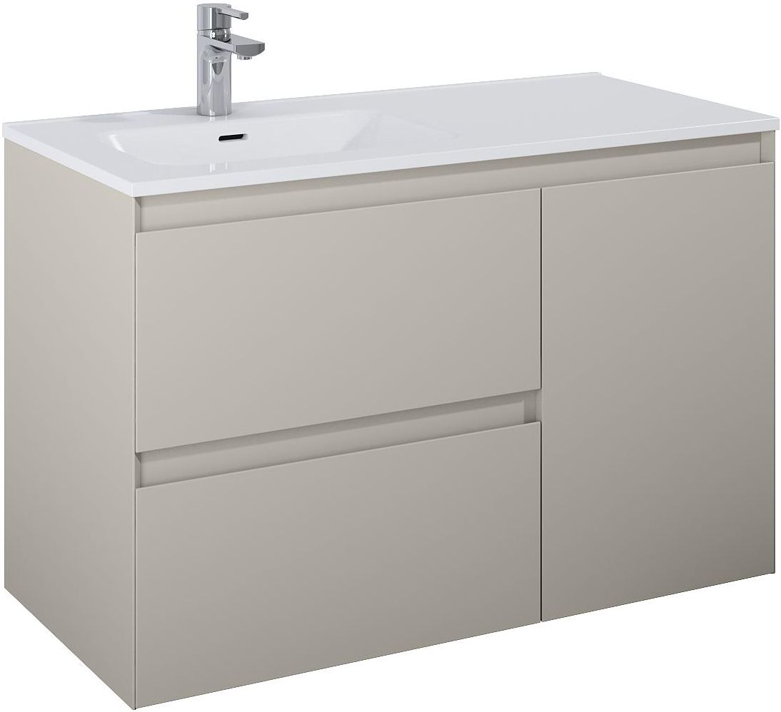 Szafka podumywalkowa z koszem cargo 100x63,5x45,8 cm ELITA SPLIT 100 fume matt RE011006057020 Rozmiar: 100 x 63.5 x 45.8 (cm) Waga: 43 (kg) Kod produktu: 169005 Dostępne wersje kolorystyczne: Opis produktu: Szafka podumywalkowa Split 100, składa się z szafki podumywalkowej 60 i komody 40 z koszem cargo, umieszczonej po prawej stronie. Szafka podumywalkowa z 2 szufladami z metalowymi bokami, z pełnym wysuwem i systemem system soft - close. Kosz cargo w komodzie posiada wytrzymałe prowadnice o udźwigu do 20 kg, z pełnym wysuwem i systemem soft-close. Szafka wykonana z materiałów wysokiej jakości, front i korpus z płyty laminowanej, lakierowanej w kolorze fume matt. Frezowane uchwyty wyprofilowane pod kątem 45°. Szafka przystosowana do łączenia z blatami ElitStone.